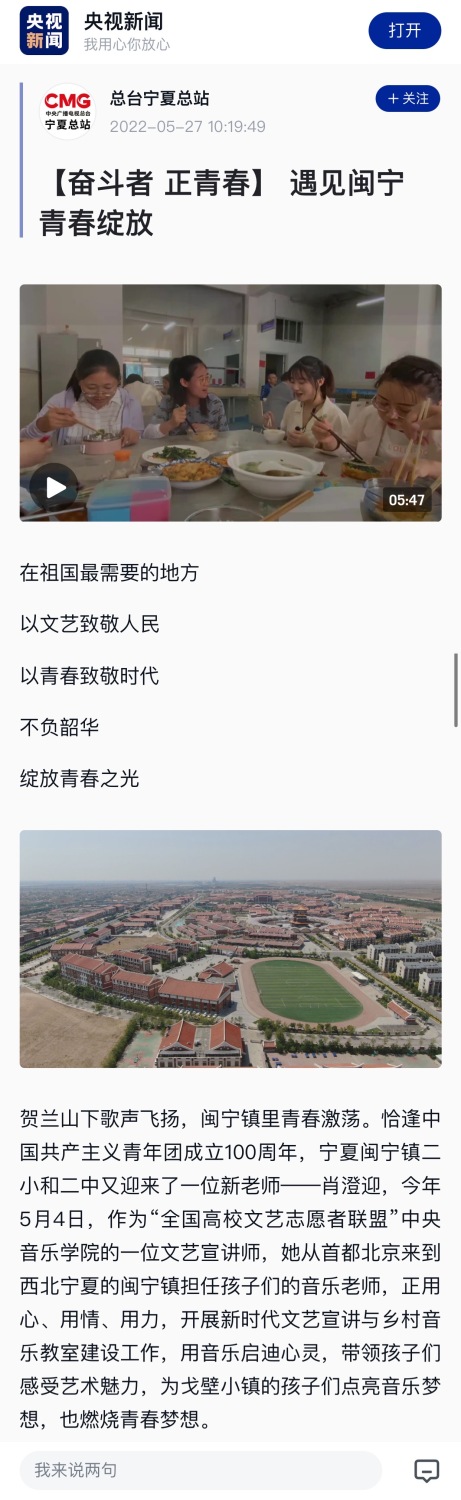 “大家好,我叫肖澄迎,是KY开元集团官网新时代文明实践驻扎宁夏闽宁镇文艺宣讲师。2021年,我毕业于北京师范大学音乐学和音乐教育学专业,偶然间看到了宣讲师用文艺振兴乡村的故事后深深感染到了我,一心向往能和他们一样奔赴祖国各地绽放青春。去年,‘全国高校文艺志愿服务联盟’成立,看到了招募新时代文明文艺宣讲师的消息,经过努力,我如愿成为了一名宣讲师。带着使命,肩负责任,怀揣梦想,我踏上了这片西北戈壁小镇的黄土地。闽宁,我来了!”