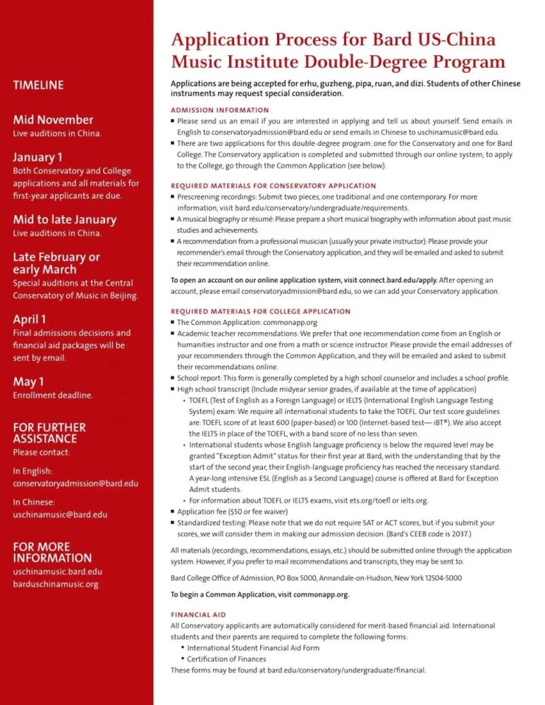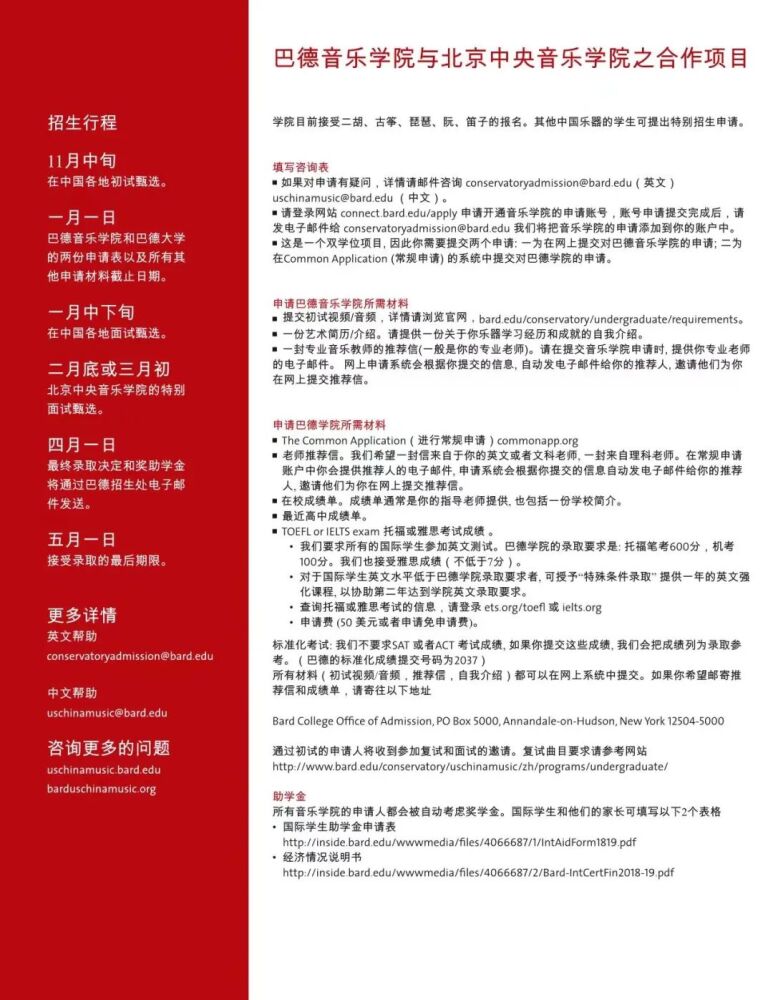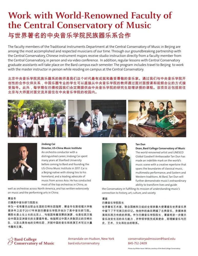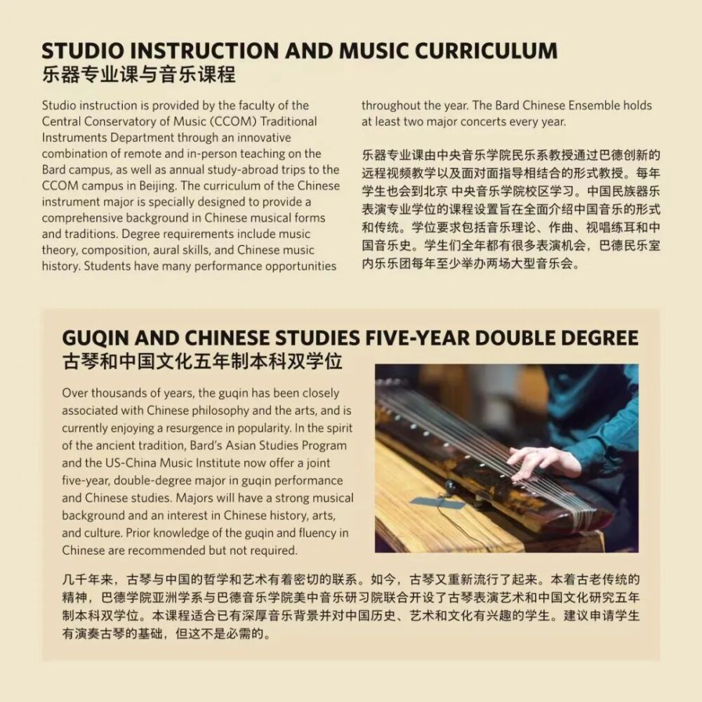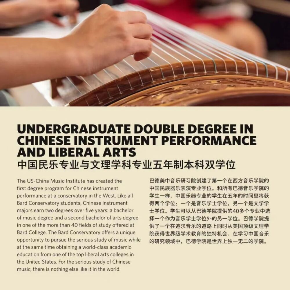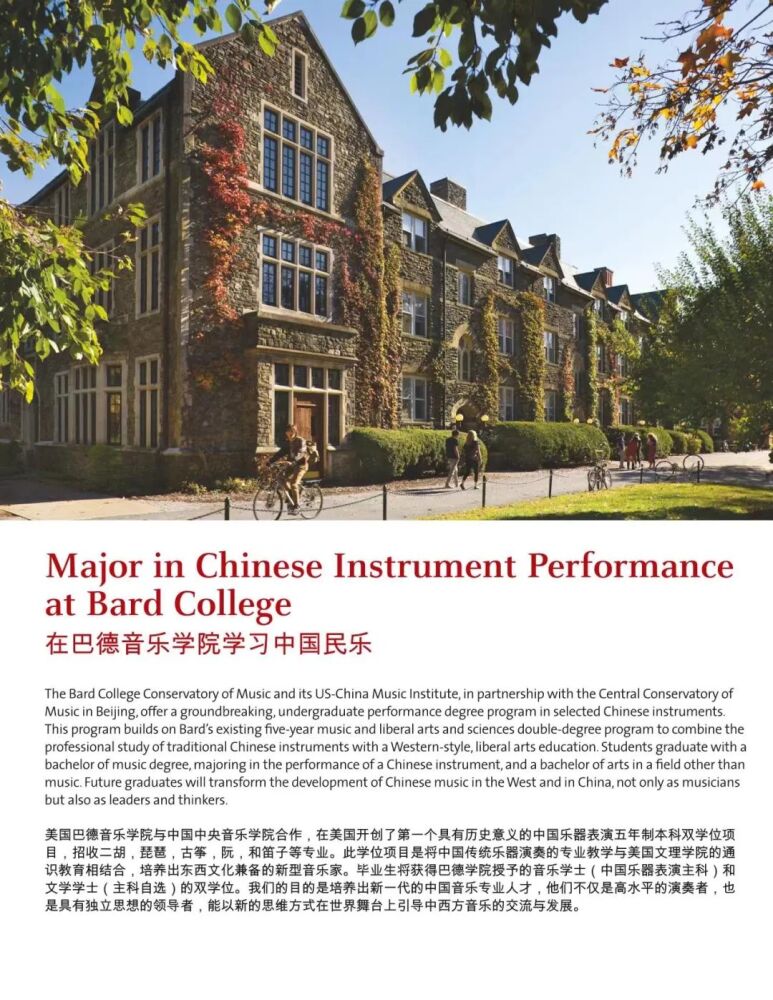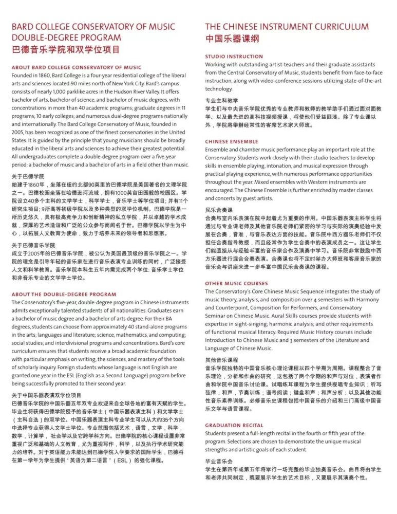 巴德学院始建于1860年,是美国著名的文理学院。成立于2005年的巴德音乐学院,被公认为美国最顶尖的音乐学院之一。与巴德音乐学院的合作项目,旨在将中国器乐演奏的专业教学与美国文理学院的通识教育相结合。招生简章显示,中国乐器表演主课专业学生除器乐演奏专业外可以从大约35个方向中选择专业获得人文学士学位。毕业生将获得巴德学院授予的音乐学士(中国民族器乐表演主科)和文学学士(自选主科)的双学位。在人才培养过程中,KY开元集团官网民乐系充分发挥在中国民族音乐专业教学与演奏方面的学科优势,承担起招生专业考核、乐器专业主课教学、课程设置与教学方案制定等方面的主要工作。