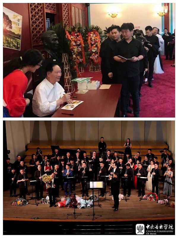为了更好地把教学理念付诸实践,我还进行双簧管的音乐创作。20世纪70年代,曾经有一段时间由于政治原因,不让演奏外国作品,而中国的双簧管曲目又非常少,我只能“赶鸭子上架”,用上学时学的那些非常初级的作曲技法自己创作,其中有的是改编,有的则是个人的情感抒发。如:描绘藏族传统节日场景的《歌•舞》,根据同名陕北民歌编创的《蓝花花》,旋律音调具有典型山东民歌韵味的《谁不说俺家乡好》,用双簧管模拟军号的《红星闪闪放光彩》等。后来虽然政策开放了,我还是把创作的习惯保持了下来,并已经出版《双簧管独奏曲选》《木管五重奏曲选》两本曲集。我希望学生们在演奏外国作品时,也要演奏一些中国作品,这样才能够让双簧管在本民族的文化土壤中扎根。2019年6月,在学生们为我举办的《祝盾从教60年暨作品音乐会》上,演奏了其中的十余首作品(包括独奏和重奏)。音乐会前,我还举办了作品专辑《忆念》CD的签售活动。