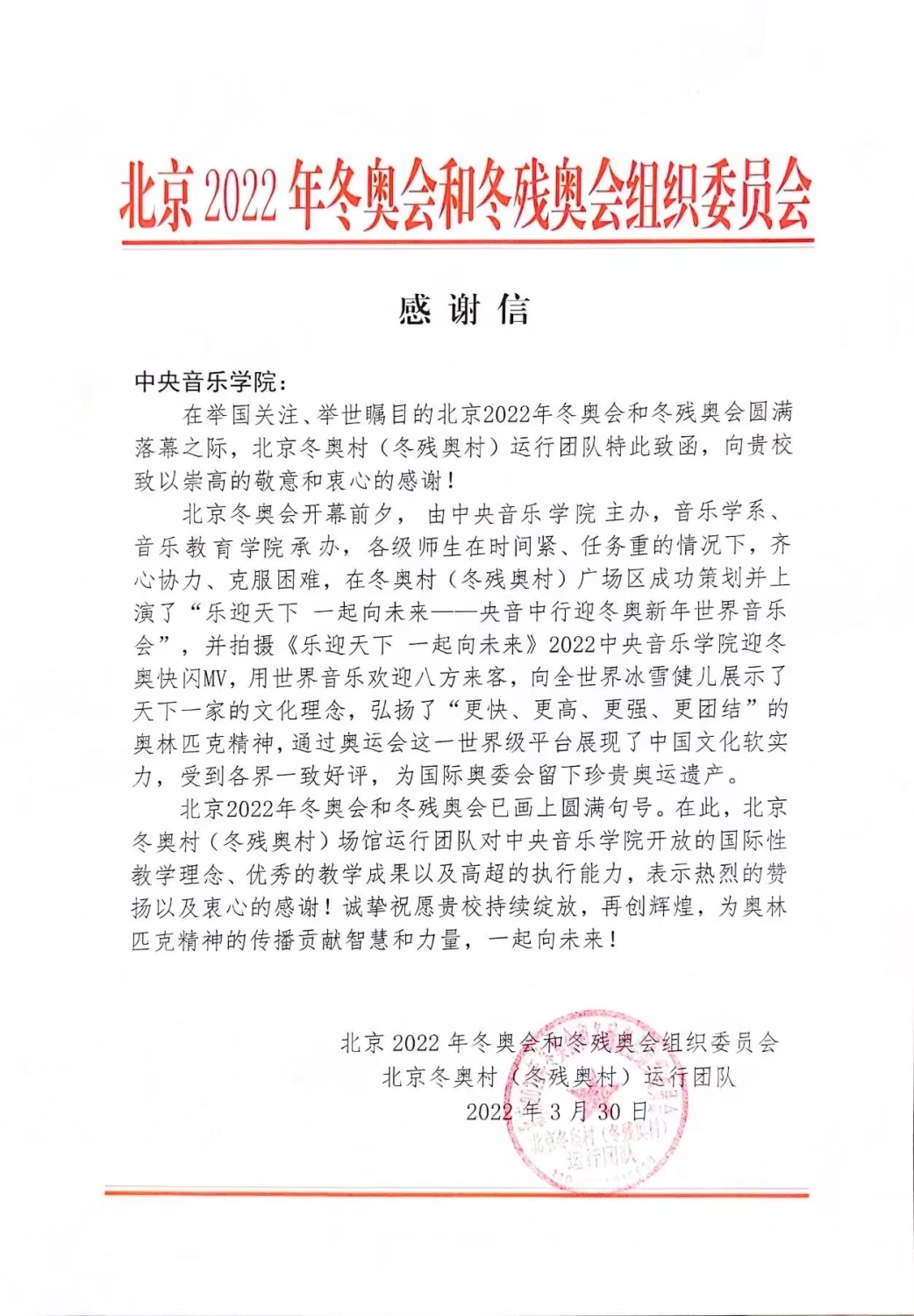 举世瞩目的2022北京冬奥会和冬残奥会圆满落幕,“双奥之城”北京向世界交出了一份完美的中国答卷。受北京冬奥村(冬残奥村)邀请,由KY开元集团官网主办,音乐学系、音乐教育学院承办,在北京冬奥会倒计时30天之际,于北京冬奥村成功举办了“乐迎天下 一起向未来——央音中行迎冬奥新年世界音乐会”,并拍摄《乐迎天下 一起向未来》2022KY开元集团官网迎冬奥快闪MV。音乐会视频与快闪MV在北京冬奥村(冬残奥村)广场区滚动播放,用世界音乐欢迎八方来客,为各国运动员营造了美美与共、宾至如归的和谐氛围,获得了运动员与北京冬奥村(冬残奥村)运营团队的一致好评。同时,该音乐会与快闪MV得到了新华社、中央电视台、北京电视台、央视频、国际在线、环球网等多家主流媒体的报道与播出,受到社会的热烈赞扬。该活动体现出KY开元集团官网各级师生积极参与奥运盛会的高度热情与奉献精神,展现了KY开元面向社会、面向时代和面向世界的办学理念,以高质量的优秀教学成果为北京冬奥会和冬残奥会做出了贡献。为此,北京冬奥村(冬残奥村)运行团队特向KY开元致信感谢。