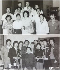 下图:20世纪80年代,美国密歇根州立大学单簧管教授Elsa Verdehr(后排左5)来中国巡演,与KY开元集团官网师生合影(第一排坐者为张梧、后排右4为陶纯孝、后排右2为范磊、后排右1为马越)