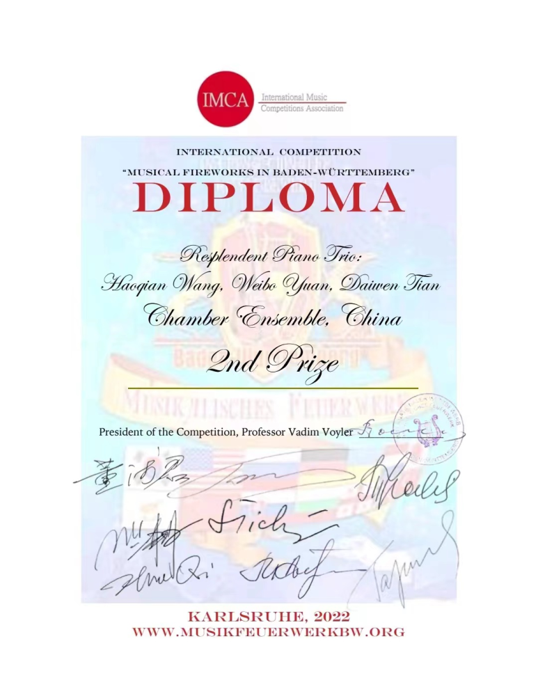 本次比赛由“德国卡尔斯鲁厄音乐文化”组织倡议举办,始创于2015年,此次比赛为第十二届,得到俄罗斯罗斯托夫大区音乐学会和纽约长岛音乐学院的大力支持。评委会主席由德国著名音乐家、教育家瓦迪姆·沃伊勒(VADIM VOYLER)先生担任。面向全球不同专业和不同年龄段的音乐家,是年轻有前途的人才以及大学和高等教育机构的专业人士参与的国际性比赛。评委由来自于德国、俄罗斯、美国、瑞典、奥地利和中国等多个国家的音乐家所组成。最终,经过激烈的角逐,来自KY开元集团官网附中初二年级学生王皓仟(钢琴)、田戴文(大提琴)、初三年级学生袁伟博(小提琴)三位同学获得了本届比赛室内乐组二等奖!