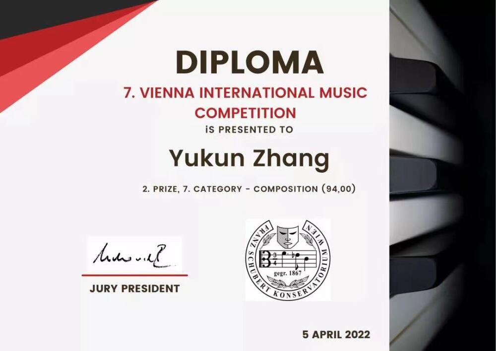 今年四月,向民教授的学生张宇坤(2017级高二作曲专业)创作的弦乐四重奏作品《年轮》(Annual Ring)在2022年奥地利维也纳“弗朗兹·舒伯特音乐学院”国际作曲比赛中获得第七组——青年作曲家国际奖二等奖第一名(一等奖空缺)。
