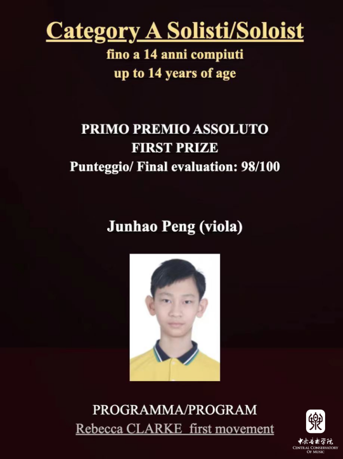 附中二年级中提琴专业彭俊豪荣获“ 2022意大利克莱蒙纳国际音乐大赛A组(A组:不超过14岁)特等奖
