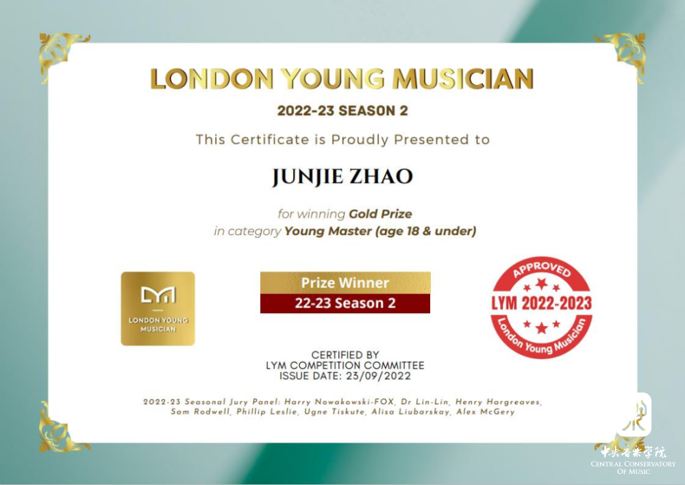 管弦系本科小提琴专业一年学生赵俊杰荣获伦敦青年音乐家大赛金奖及最佳演奏特别奖、美国2022王者之巅国际古典音乐比赛第一名