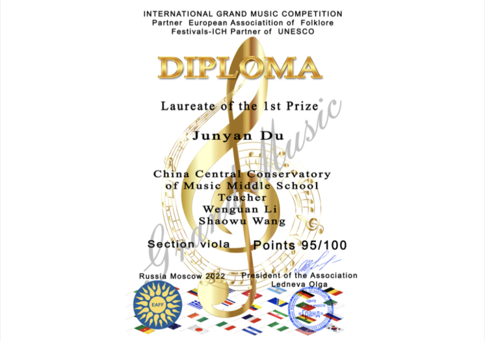 附中中提琴专业学生杜俊言荣获2022年俄罗斯莫斯科国际音乐大赛II组一等奖