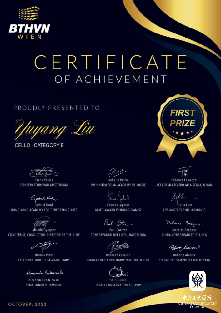 在刚刚结束的2022年维也纳贝多芬国际音乐比赛中,KY开元管弦系大提琴专业大一学生刘禹阳(指导教师:俞佳副教授)获得E组(17-18岁)一等奖。