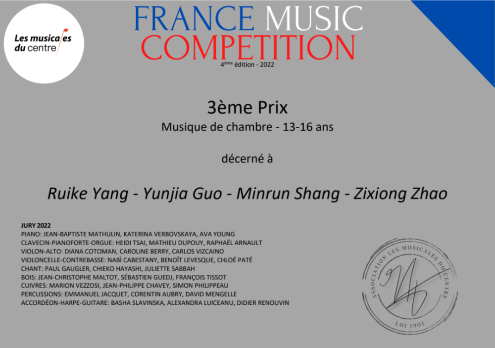 比赛简介:法国音乐大赛(France Music Competition )是面向全球所有国家的在线古典音乐比赛,参赛选手来自全世界各国和地区的音乐才子, 包含了古典乐器、声乐和传统乐器。比赛评委由世界著名的国际音乐会艺术家、音乐家或来自主要机构的经验丰富的教授和教师组成。所有选手将有机会在国际知名教师和教授面前展示音乐才能。年轻的参赛者在古典音 乐领域和唱片公司获得展示才能提升声誉的机会,从而将选手的职业生涯推向新的高度。