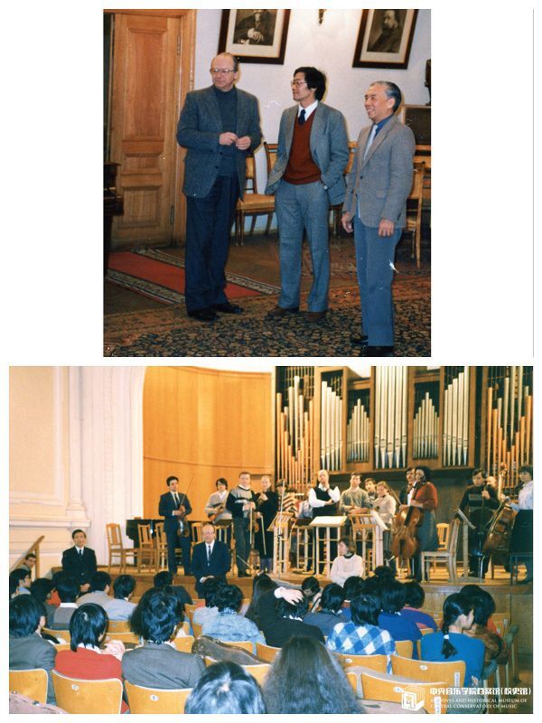 上图,吴祖强(右)、陈佐湟(中)参观莫斯科柴科夫斯基音乐学院