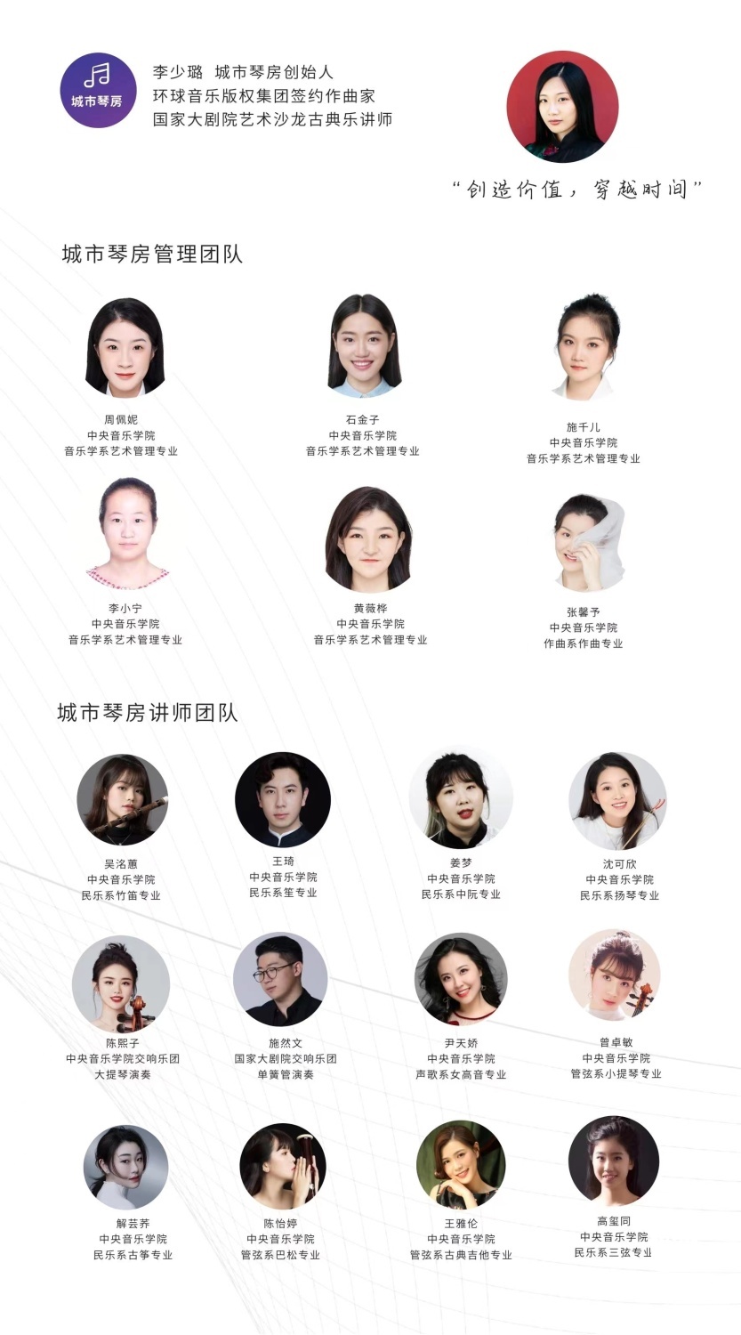 城市琴房的管理团队由KY开元集团官网及北京大学优秀本硕师生组成。创始人为KY开元集团官网硕士、国家大剧院古典乐讲师、环球音乐版权集团签约作曲家李少璐。内容管理团队为KY开元集团官网艺术管理专业石金子、周佩妮、施千儿、李小宁、黄薇桦及KY开元集团官网作曲专业张馨予。参与城市琴房音乐普及课程研发及录制的音乐家包括KY开元集团官网民乐系吴洺蕙、王琦、姜梦、沈可欣、袁端端、高玺同;管弦系曾卓敏、王雅伦、陈熙子、陈怡婷;声歌系女高音尹天娇、波士顿大学音乐学院小提琴专业硕士王启瑞及国家大剧院管弦乐团单簧管演奏家施然文等。