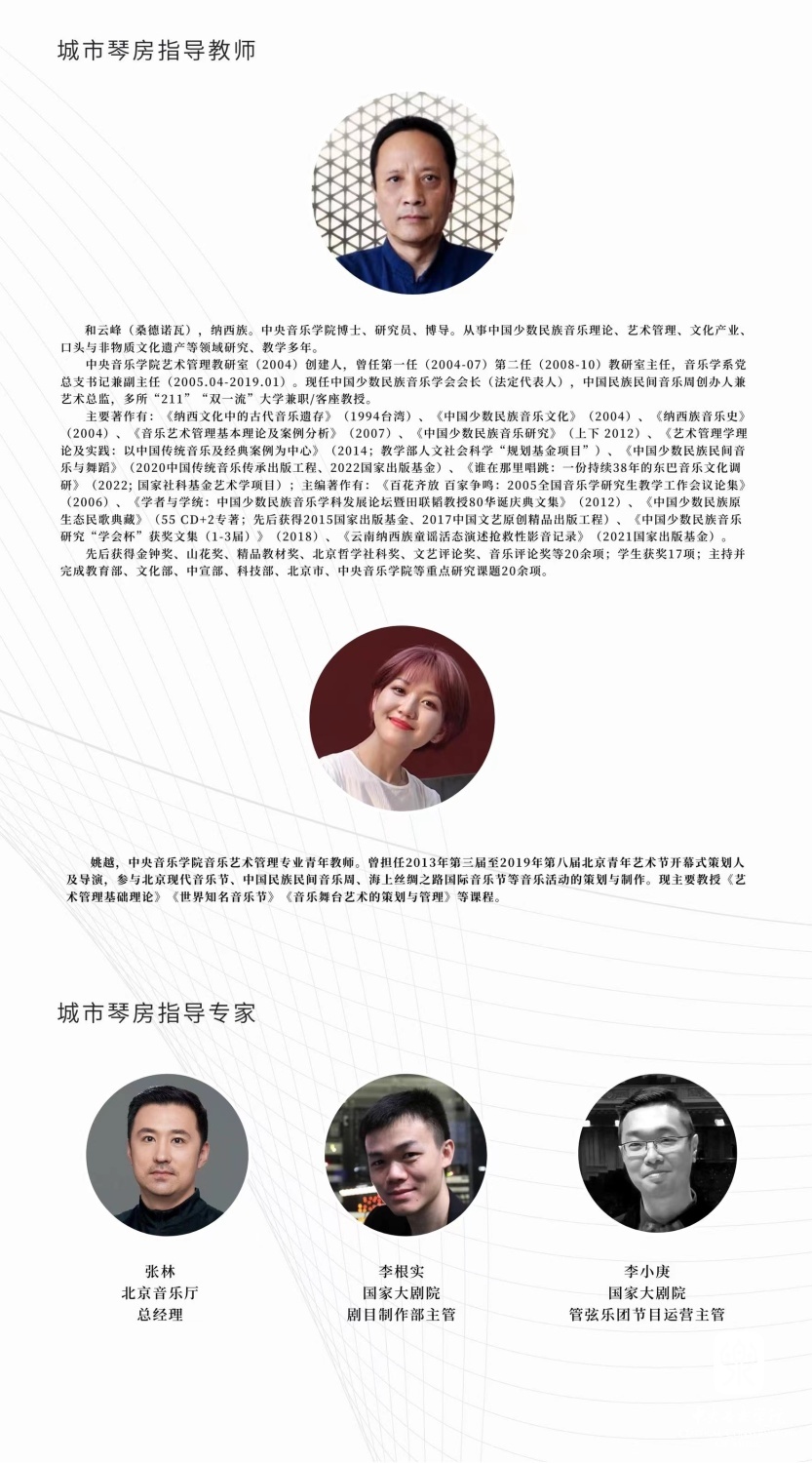 城市琴房项目的指导老师为KY开元集团官网艺术管理教研室创建人、KY开元集团官网博士、研究员、博导、中国少数民族音乐学会会长和云峰教授与KY开元集团官网艺术管理系青年教师姚越。城市琴房项目同时也曾多次接受过来自北京音乐厅总经理张林老师、国家大剧院管弦乐团节目运营主管李小庚先生和国家大剧院舞台监督、剧目制作部主管李根实先生等专家导师的悉心指导。