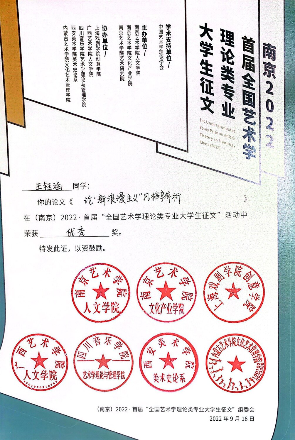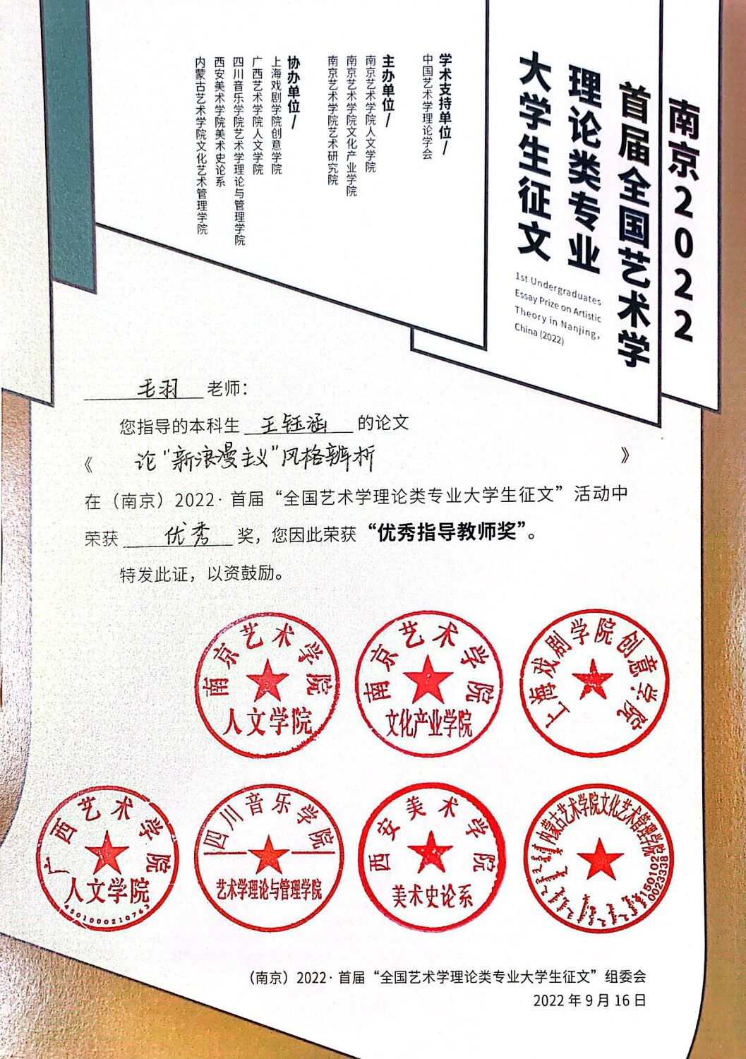 音乐学专业本科三年级学生王钰涵以论文《论“新浪漫主义”风格辨析》(指导老师:毛羽)荣获优秀奖。