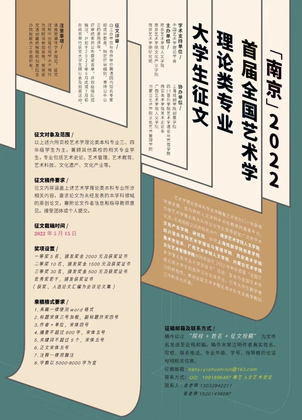 (南京)2022·首届“全国艺术学理论类专业大学生征文”活动是在中国艺术学理论学会支持下,由南京艺术学院人文学院、文化产业学院、艺术研究院主办,上海戏剧学院创意学院、四川音乐学院艺术学理论与管理学院、西安美术学院美术史论系、广西艺术学院人文学院、内蒙古艺术学院文化艺术管理学院协办,首次面向上述院校艺术学理论类及其他高校相关专业在读本科生举办的学术征文活动。
