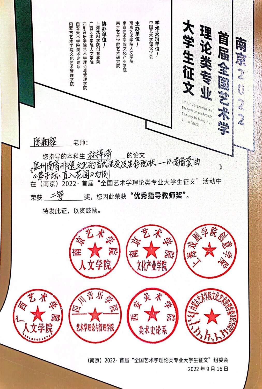 音乐学专业世界民族音乐方向本科四年级学生林梓琦以论文《泉州南音非遗文化的当代流变及生存现状——以南音套曲< 弟子坛·直入花园>为例》(指导老师:陈朝黎)荣获二等奖。