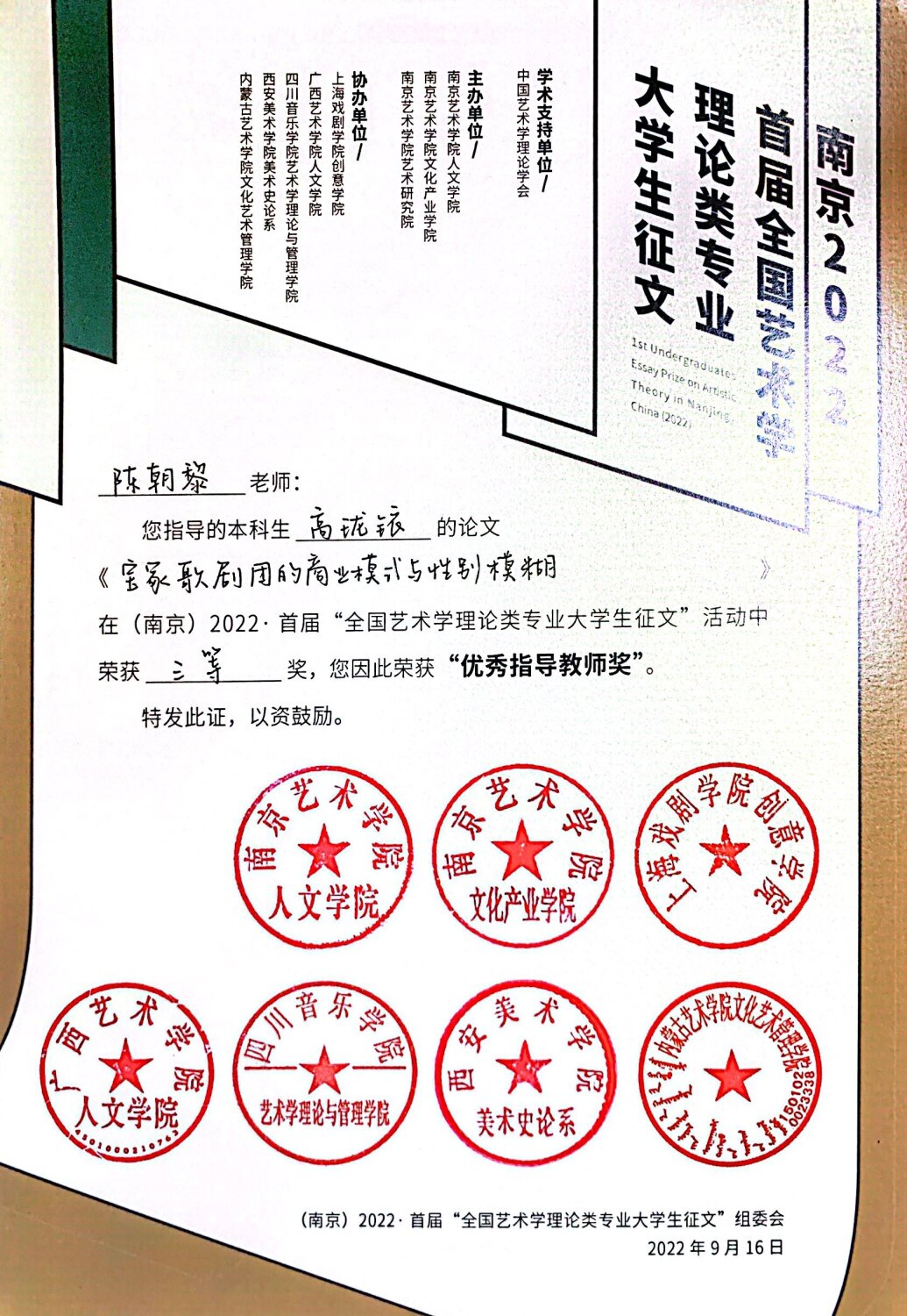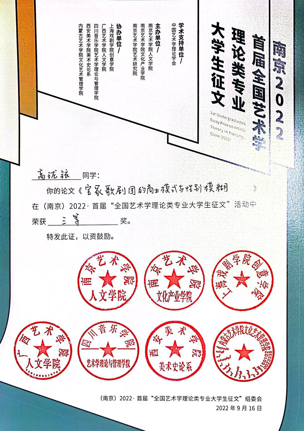 音乐学专业世界民族音乐方向本科五年级学生高珑铱以论文《宝冢歌剧团的商业模式与性别模糊》(指导老师:陈朝黎)荣获三等奖。