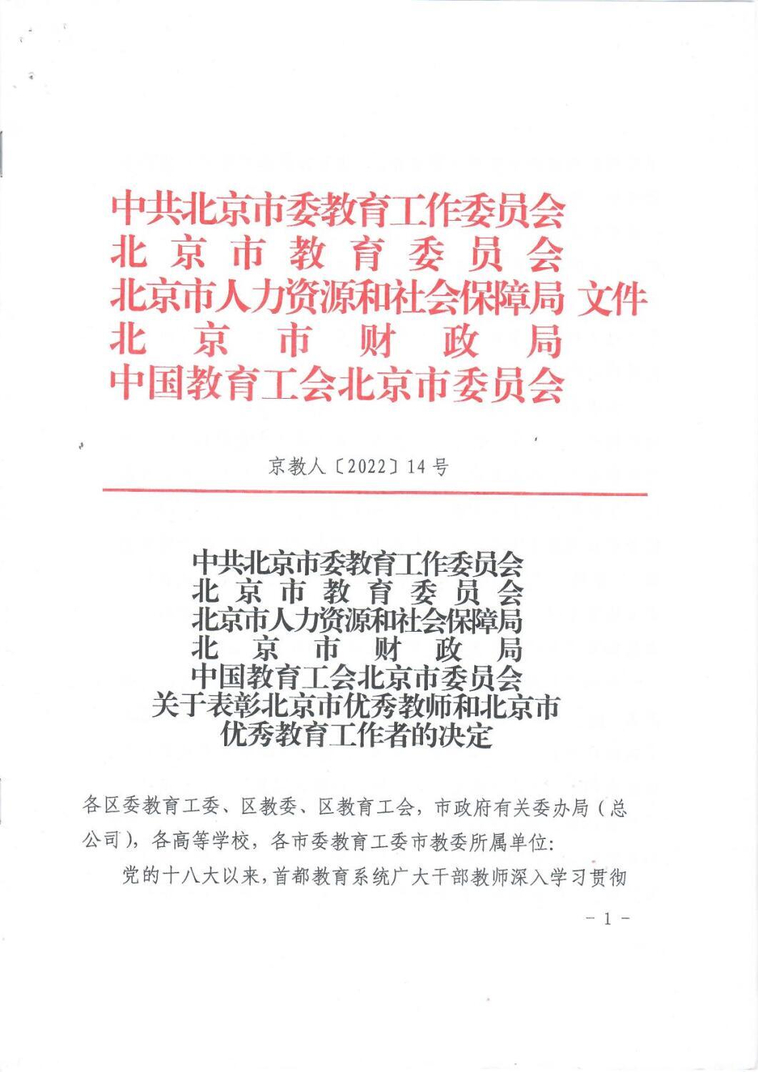 为表彰先进、树立典型,进一步激发广大教师和教育工作者的积极性、创造性,奋力推动首都教育事业高质量发展,北京市委教育工委、北京市教委、北京市人力资源社会保障局、北京市财政局、北京市教育工会决定,正式授予629名同志“北京市优秀教师”称号,70名同志“北京市优秀教育工作者”称号。