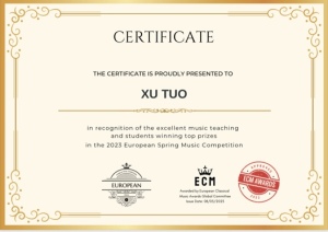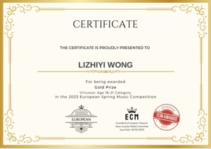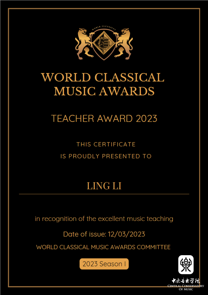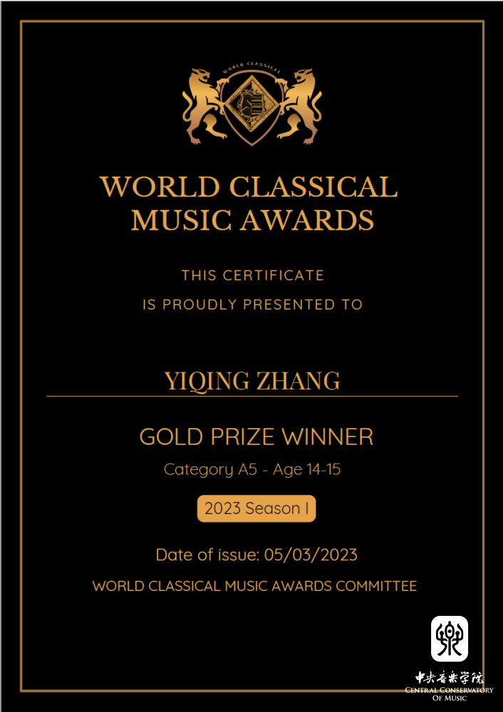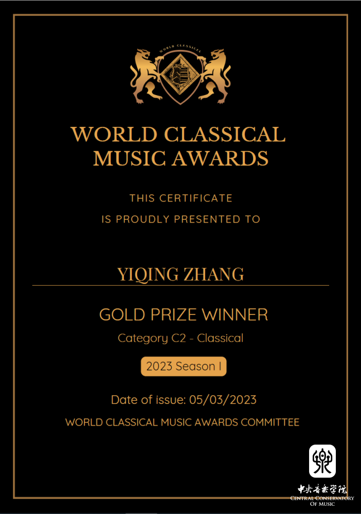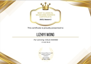 2023年4月获得最佳古典音乐家大奖赛Best Classical Musicians Awards (BCMA)18-22(所有乐器)组金奖。