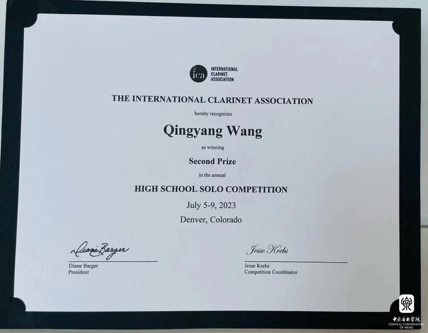 附中初三年级单簧管专业学生王清阳荣获国际单簧管协会第50届年会(丹弗)青少年比赛世界青少年单簧管比赛第二名