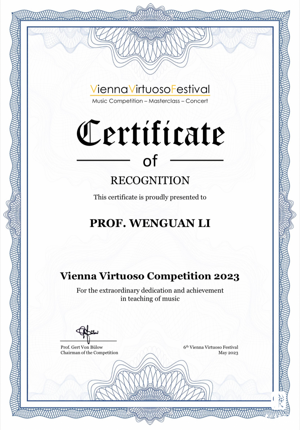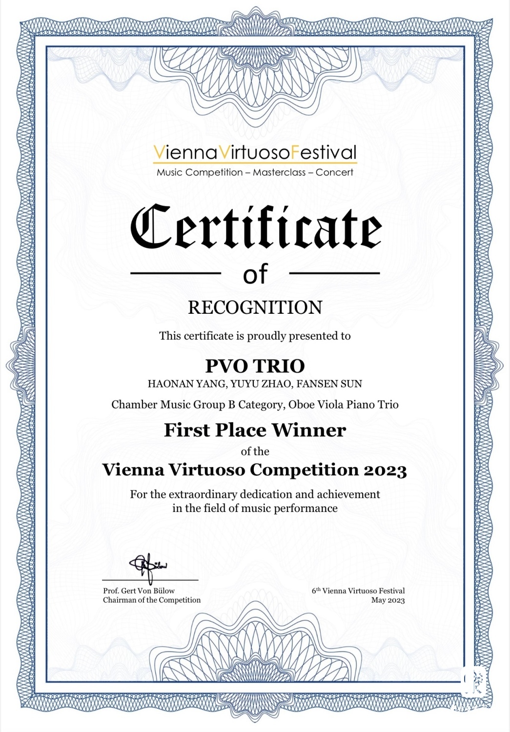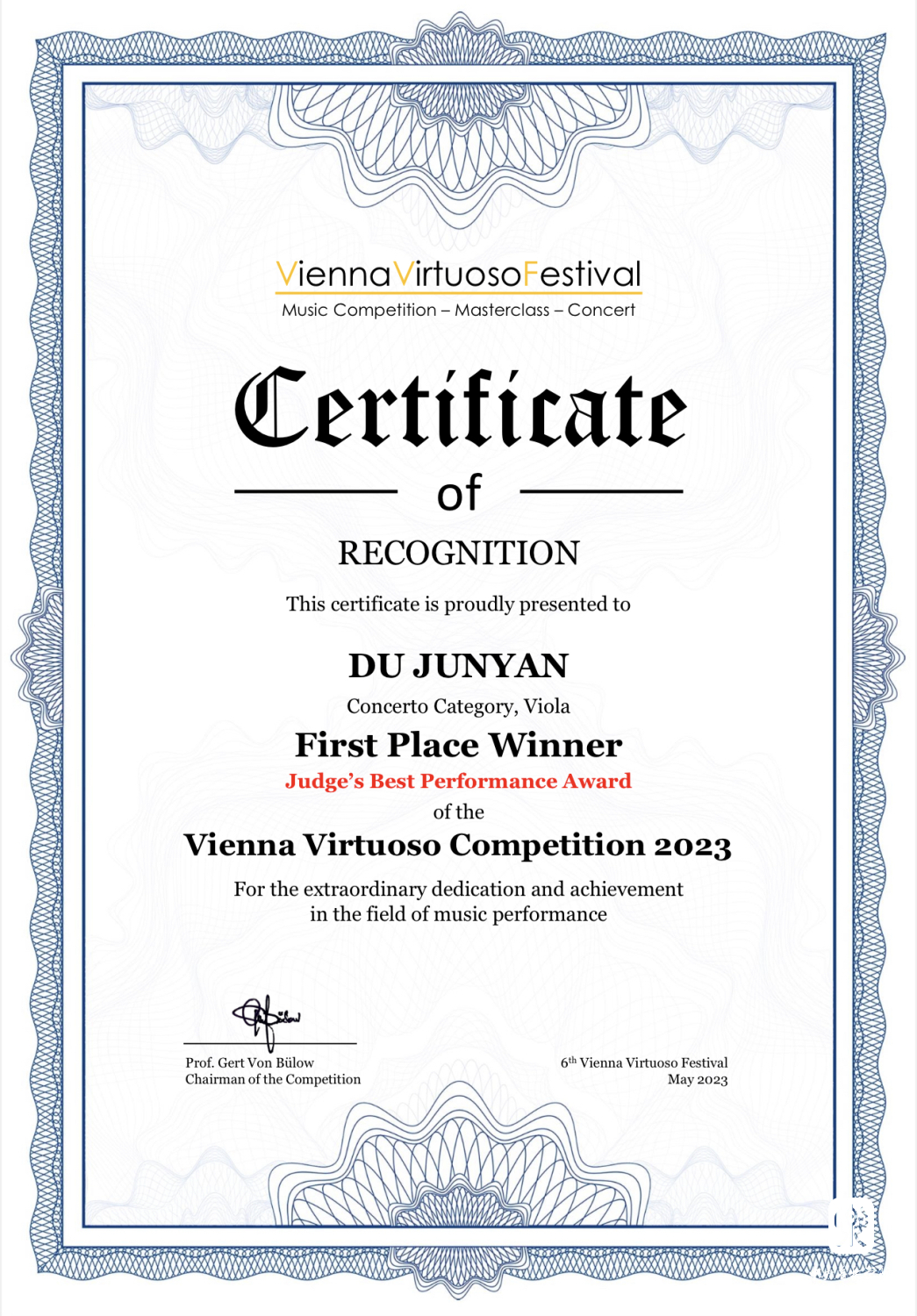 1.2023年第六届维也纳演奏家音乐比赛少年组第一名、协奏曲无年龄限制组别第一名以及评委会授予的最高演奏奖;