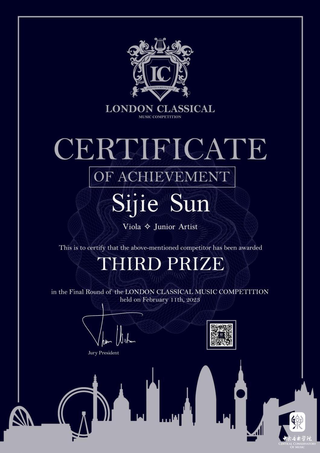 附中中提琴专业学生孙思杰荣获2022 伦敦古典音乐比赛(LCMC)中提琴组三等奖