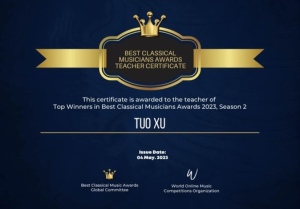 2023年最佳古典音乐家大奖赛Best Classical Musicians Awards (BCMA)由世界在线音乐比赛联合会,英国True Art 古典音乐数字电视台新古典音乐家杂志联合举办。
