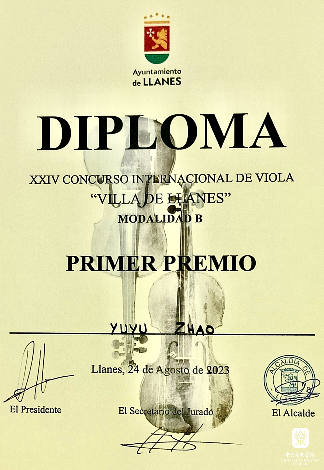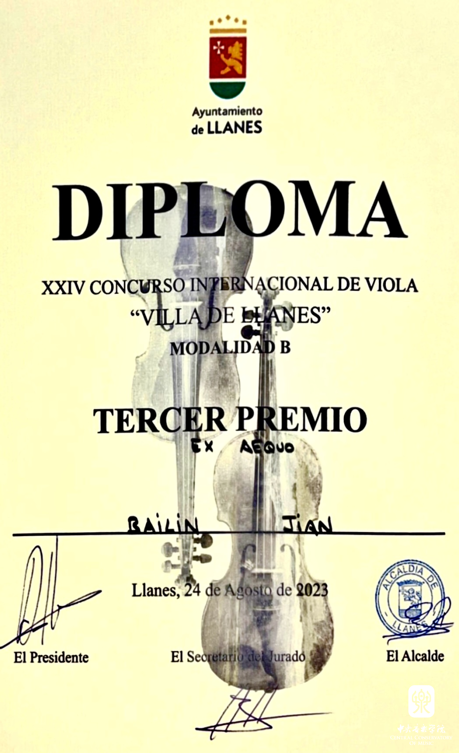 2023年西班牙Llanes 第24届中提琴国际比赛少年组第二名;