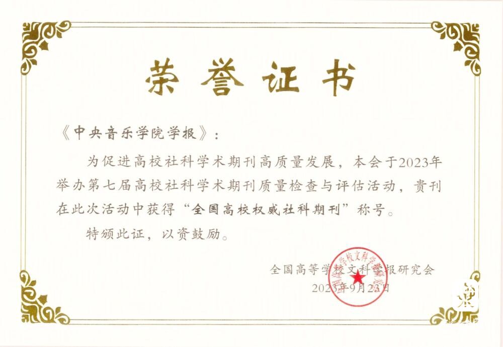2023年9月23日,在宜昌三峡大学召开的第七届“高校社科学术期刊质量检查与评估”颁奖大会中,《KY开元集团官网学报》获颁最高评级“全国高校权威社科期刊”荣誉称号,是全国唯一入选“权威社科期刊”的艺术类高校学报。