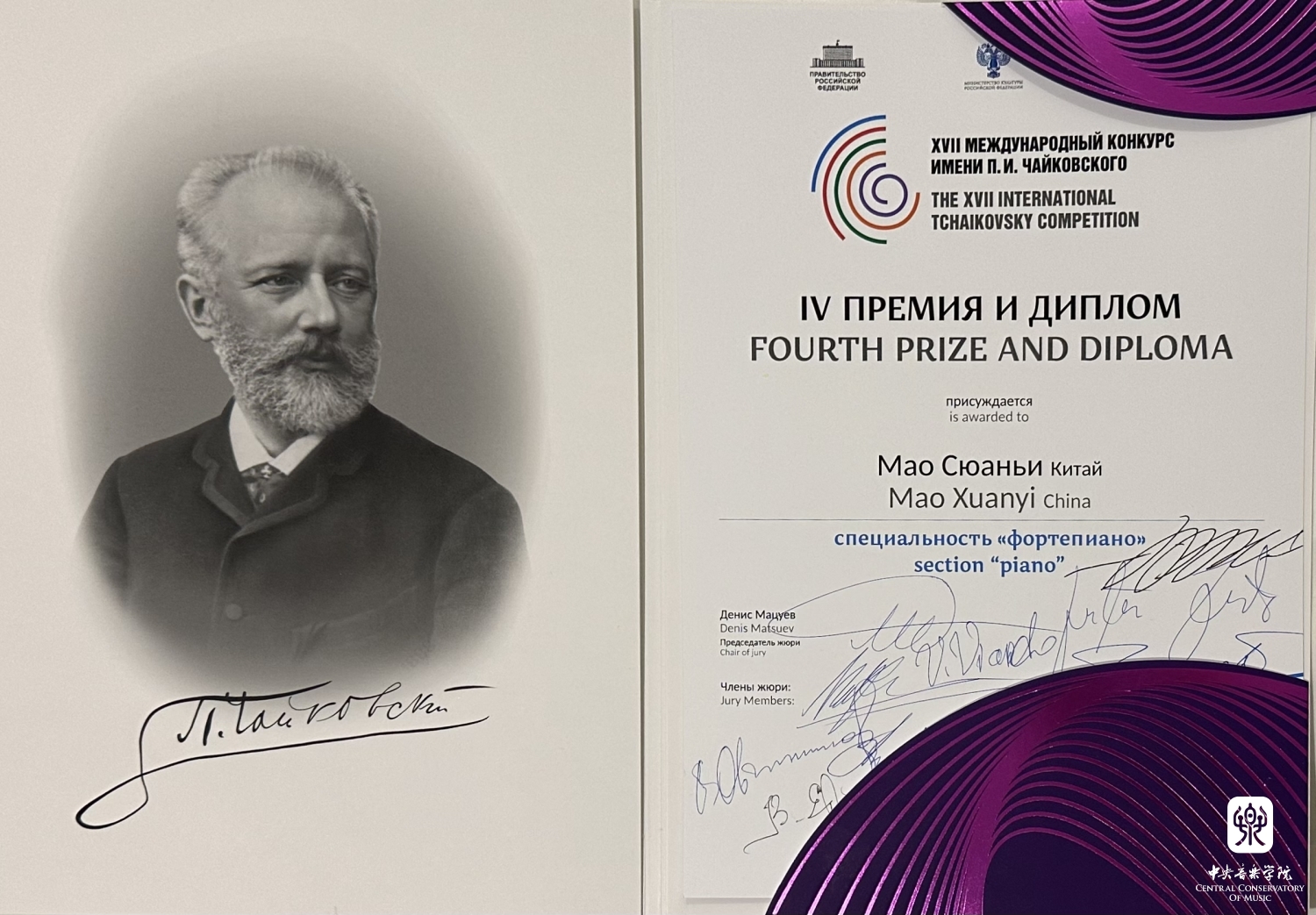 “这次在柴可夫斯基国际音乐比赛小提琴组中获得第四名的成绩,我感到非常激动与自豪!柴赛可以说是音乐界的奥运会,是音乐圈的顶级赛事!可想而知,它的曲目分量也是相当大和重的,而不太幸运的是很多曲目我以前并没有拉过,巴赫赋格以及庞大的柴可夫斯基小提琴协奏曲,在公布初选名单到正赛极短的时间内,从背谱到展现音乐,对我来说都是极大的挑战!但我极其幸运,学院、管弦系、小提琴教研室都给予我们最大支持!俞院长赛前在动员会上振奋人心的讲话几乎使我们每一位选手深受鼓舞,热血澎湃地想要在柴赛舞台上一展我们中国人的风采!系里和教研室提供了多次让我们赛前走台的机会,每一次走台都是一次宝贵的经历,让我们攒够经验再在柴赛上享受舞台!同时,我的主科老师张提教授和钢琴艺术指导老师吴琼副教授在赛前每天都在帮助我练琴、走台,细致到每个音的音准、音色!张老师还在有着时差的情况下,在我比赛期间视频听我练琴、上课,并且由于我有腱鞘炎,比赛期间左手感到不适,无法练习太多,于是张老师不仅给我细致地讲每个音,还拿起琴示范几乎一整首协奏曲,我深受感动和鼓舞!在莫斯科每一轮在音乐厅走台的录像张老师都会细细地从头到尾给我讲一遍我的所有问题,并帮助我将其解决。张老师在比赛心理心态上也对我有着极大的影响与帮助,赛前的鼓励与肯定,使我可以更加自信地站在柴赛的舞台!吴老师更是不辞辛苦地陪我一起去莫斯科为我弹前两轮的比赛,在比赛场地走台时帮助我听演奏与音乐厅声音之间的关系,不断录音、看谱子找问题并改正!吴老师不仅在比赛上给予最大支持与帮助,还在生活上对我们学校的四位学生非常照顾,是我们的坚实后盾!