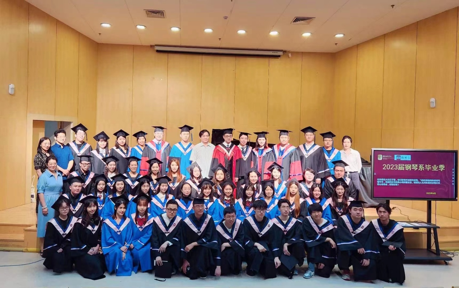 俞峰院长宣读2023年博士、硕士、学士学位授予决定,举行拨穗授礼仪式。优秀毕业生、各院系毕业生依次上台,接受导师拨穗、学位授予。