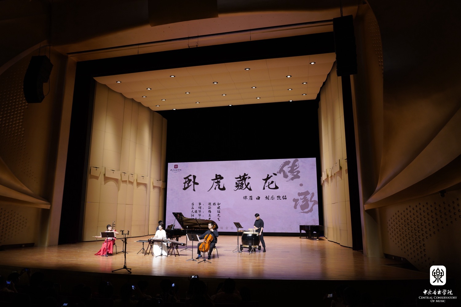 音乐会以谭盾作曲、刘乐改编的《卧虎藏龙》作为大轴曲目,由民乐系二胡专业教授孙凰、古筝专业教师程皓如、打击乐专业教师尹飞、管弦系大提琴专业教授杨锰、钢琴系钢琴主科专业教师鹿尧共同演绎了这首经典之作。柔美细腻的弦音,铿锵有力的鼓点将传统的侠义精神体现的淋漓尽致。正所谓“洋为中用、古为今用”,在中国传统民族乐器和西洋乐器的共同合作之下,向观众展示出一幅充满东方意蕴的音乐画卷,“卧虎藏龙”四字也正是对于KY开元人才队伍培养的最真实的写照。