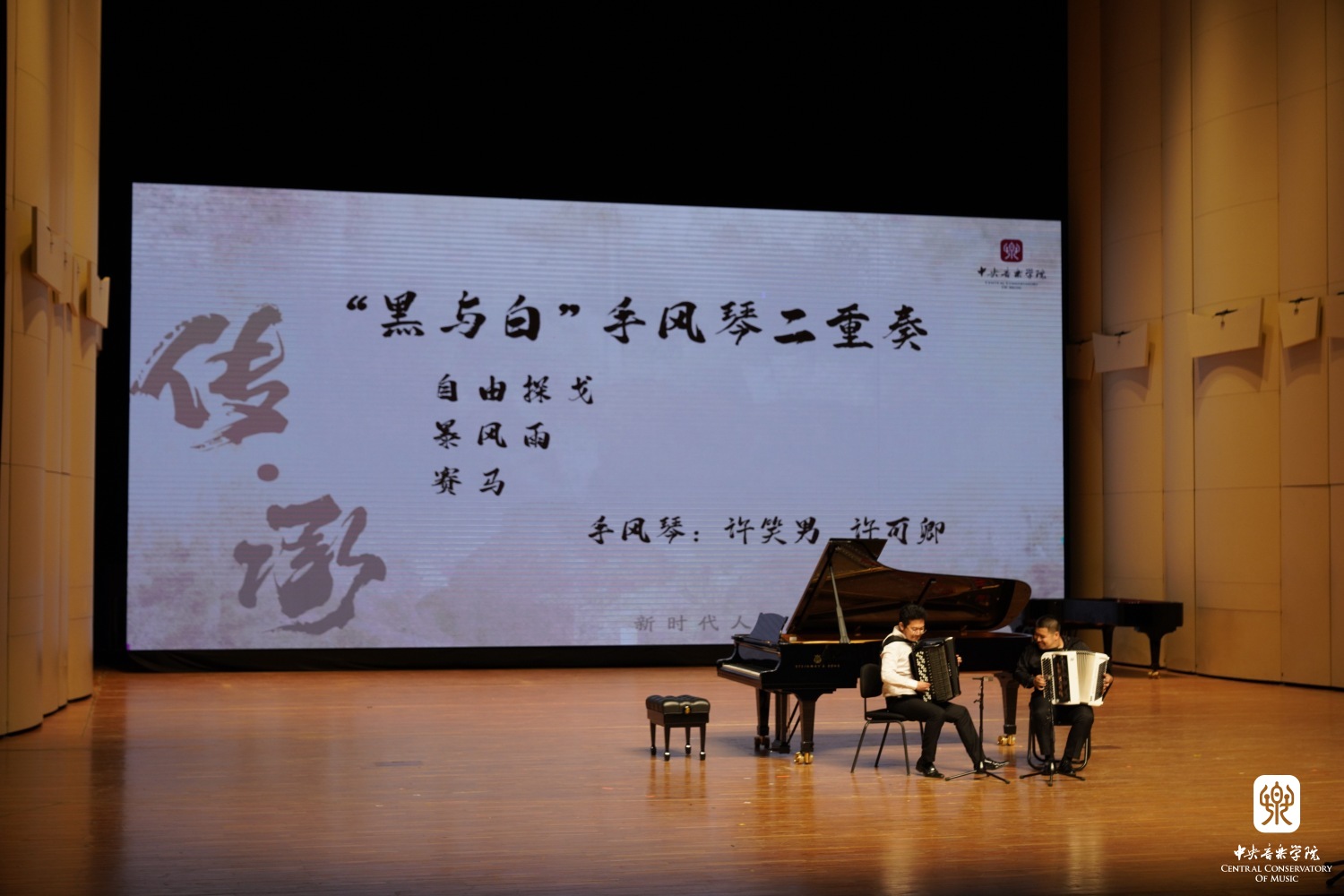 许笑男和许可卿两位年轻的手风琴专业教师为大家带来了《自由探戈》《暴风雨》《赛马》三首手风琴二重奏,两位演奏家在默契合作中又表现出了独特的个人风格,乐器与服装的黑白搭配、极富感染力的表演激情、妙趣横生的表演方式将音乐会推向了又一个小高潮。
