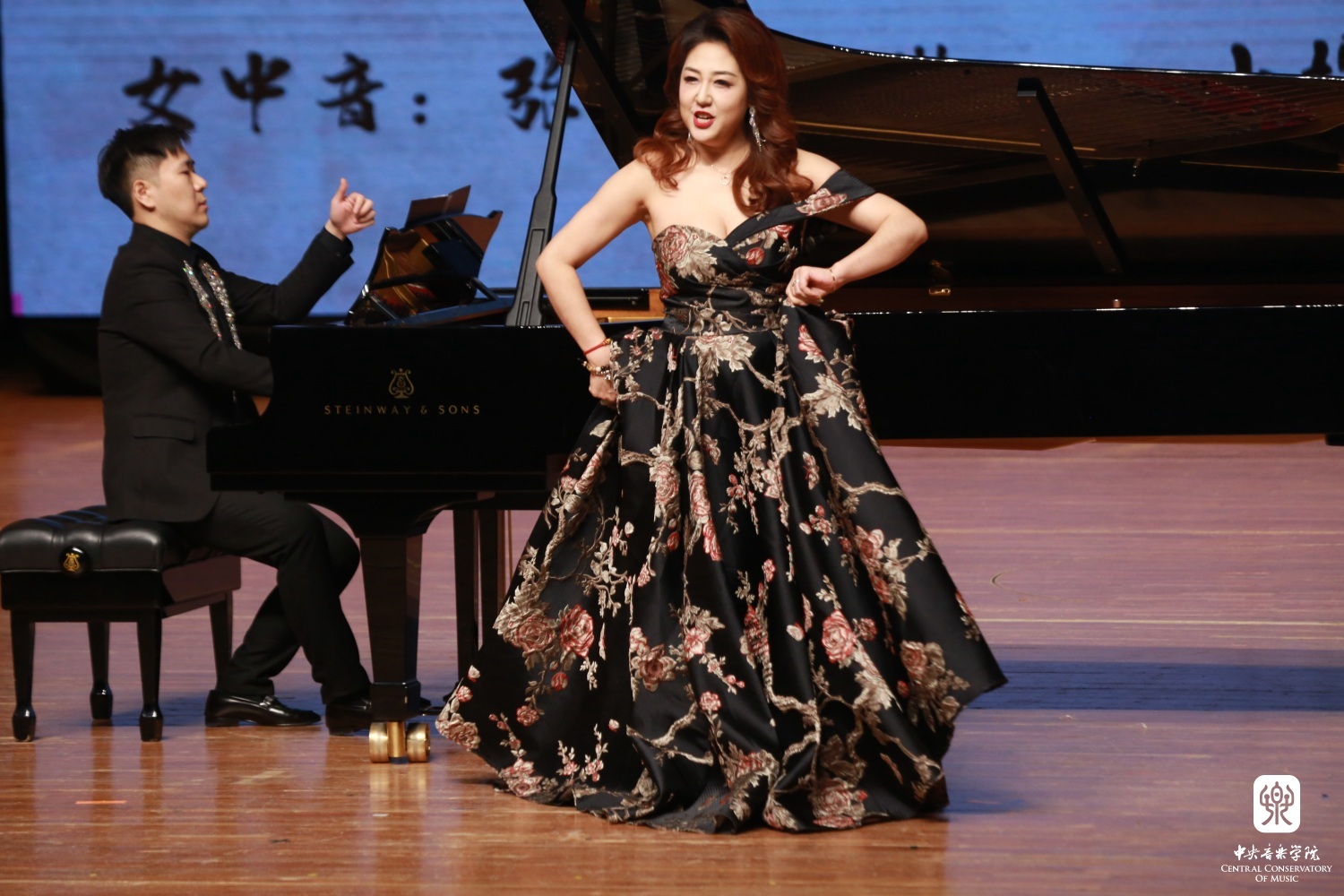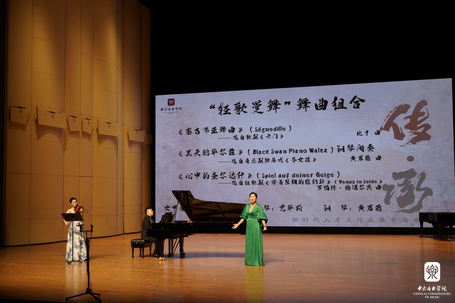 由声歌系副教授张媛(女中音)、声歌系教师石琳(女中音),管弦系小提琴专业教师党华莉,钢琴系钢琴主科教师黄若愚带来的《“轻歌曼舞”舞曲组合》赢得在场观众的阵阵喝彩,尤其两位女中音歌唱家高贵华丽、沉稳激昂的演唱,令人心醉神迷。