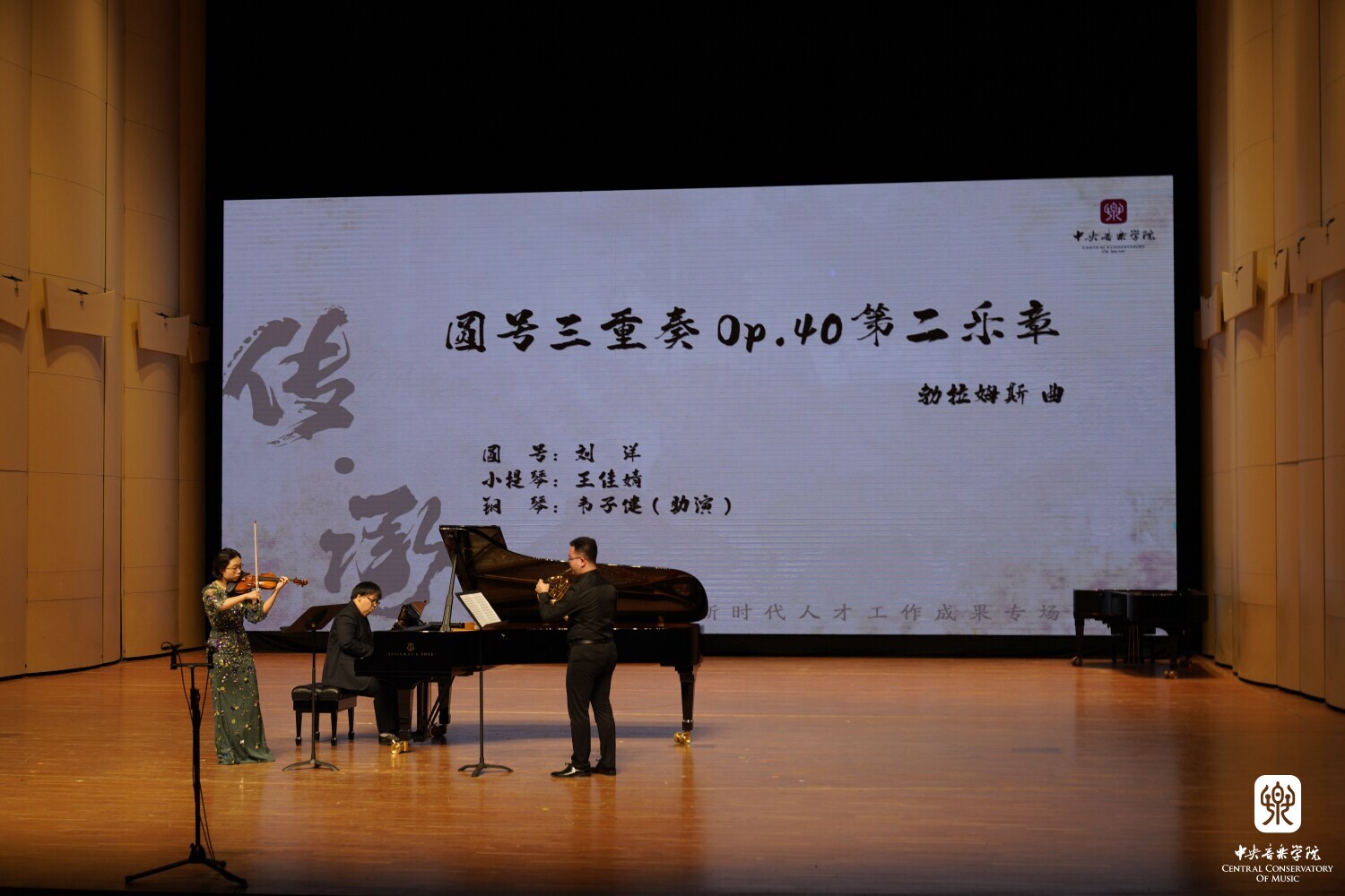 管弦系圆号专业教师刘洋、小提琴专业教师王佳婧、钢琴助演韦子健的勃拉姆斯《圆号三重奏》第二乐章,呈现出非同寻常的音响和色彩,三人的完美配合将勃拉姆斯独特的个性思想和诗意的情感世界传递出来,让观众能在忧郁的气氛中聆听到一丝幽默,在抒情的旋律中感受到一份力量。