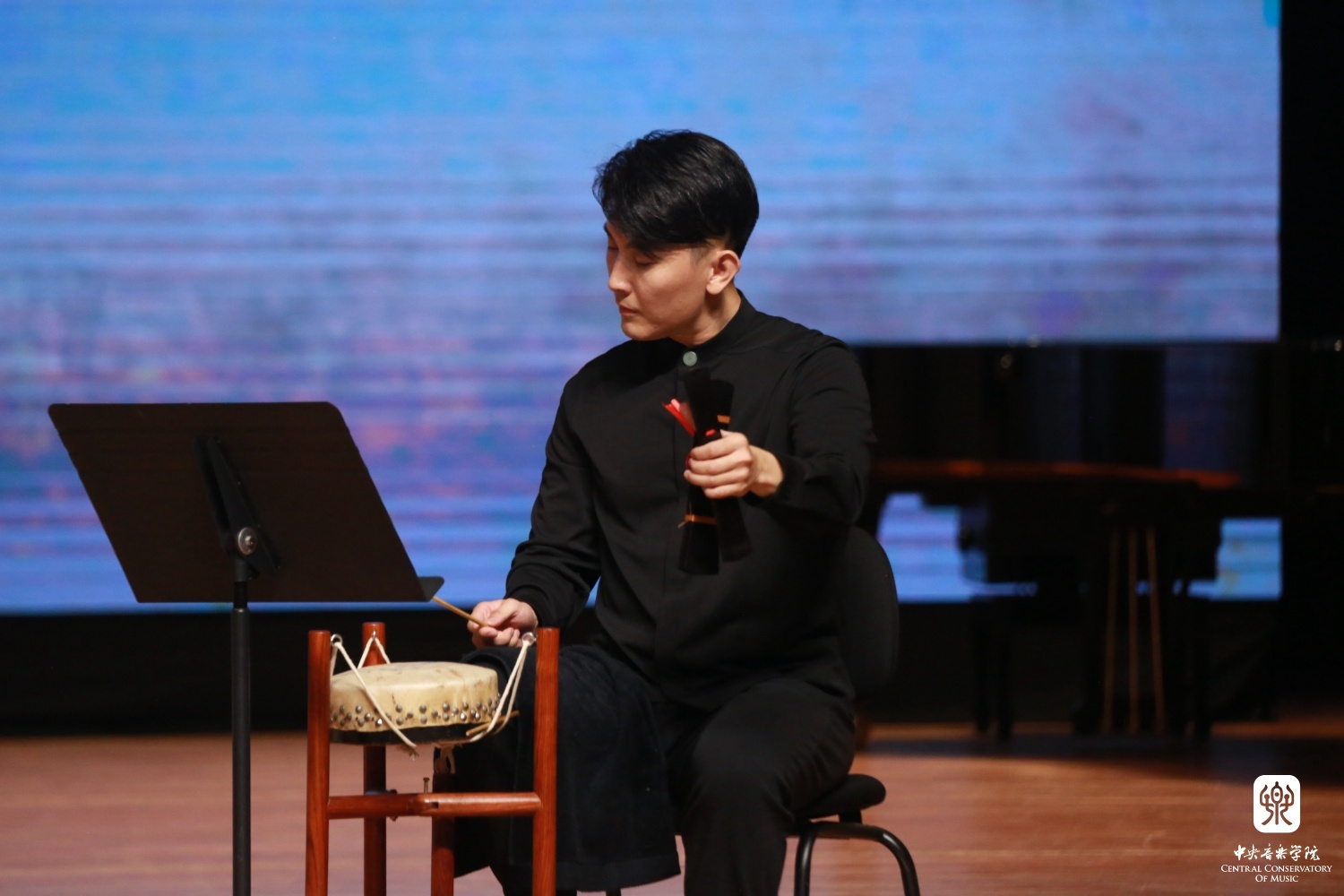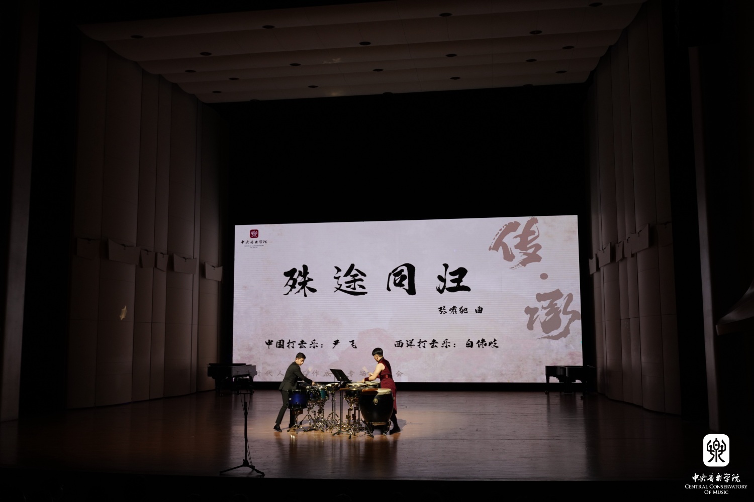 由民乐系打击乐教师尹飞、管弦系打击乐教师白伟岐联袂带来的中、西打击乐二重奏《殊途同归》拉开了演奏的序幕,中西合璧的响亮对话点燃了舞台。两种打击乐自然有着不同的表达方式、不同的演奏技法,但从音色、音量等方面来看,居然有异曲同工之处,形成了特殊的审美情趣。二者时而齐奏、时而竞技,以巧思般的互动设计和精湛的演奏技术,展现出中西打击乐特有的魅力。