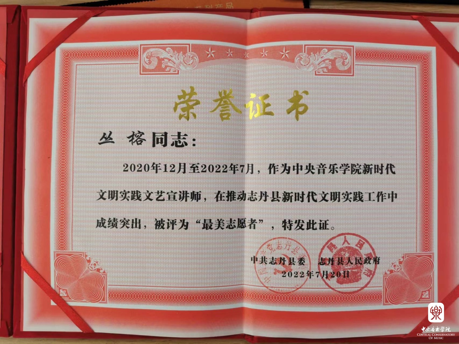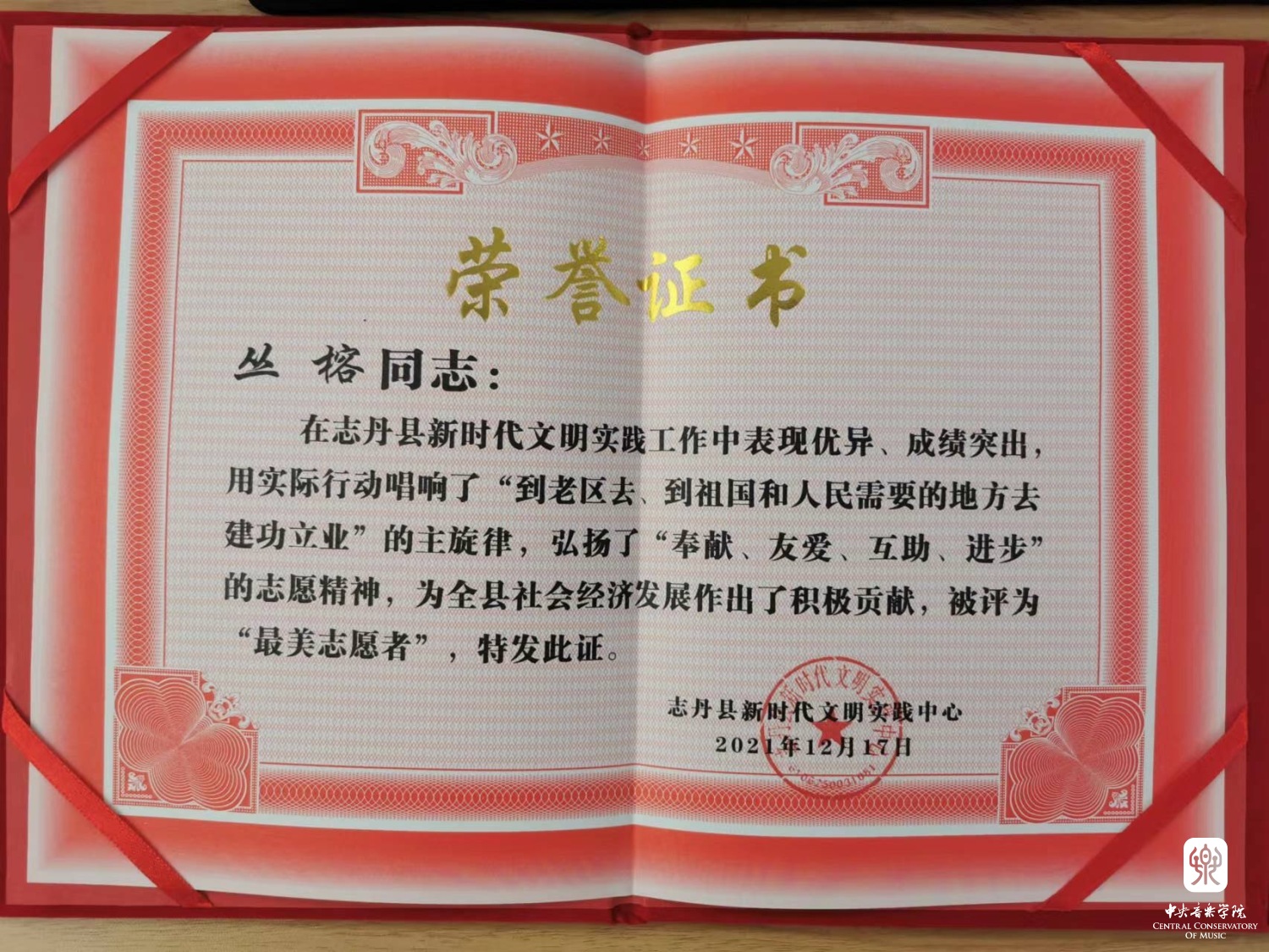 “感谢彼时的我,在两年前的那一刻留下来,去接受、改变将经历的一切,从而造就了现在的我。记得俞峰院长在启程前对我和同伴们说过一句话,“人的价值在于被需要”。我由衷地感到幸运,在学校得到最好的教育资源,走出学校又踏上了最真实广袤的大地,找到自身被需要的价值。希望更多高校各个领域的人才都能加入进来,在志愿服务中了解祖国、了解人民,用所学所长在工作中找到服务社会的道路;我愿终其一生都能作促进教育公平、文化共享的桥梁,成为以文化人、以文育人的一砖一瓦,使文艺为人民所用,做祖国文化事业的奠基者;我愿每一个“最后一公里”都能种下艺术的种子,每一个人都得到追求美、欣赏美、创造美的机会与能力,我们共同努力,为祖国装点一个更加灿烂的未来。”
