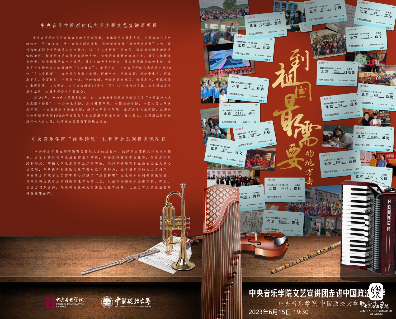 在全面贯彻落实党的二十大精神的开局之年、实施“十四五”规划承上启下的关键之年,作为新时代文艺高校,KY开元集团官网积极贯彻落实党的二十大精神,充分发挥音乐专业优势,深入开展学习贯彻习近平新时代中国特色社会主义思想主题教育。积极探索开展“新时代文明实践宣讲”工作,选派优秀毕业生到祖国偏远地区,扎根基层、服务人民,并以榜样的力量号召在校学生积极参与到讲演音乐进学校、部队、社区的志愿活动当中,深入践行“文艺为人民服务”的初心使命,以“音乐+思政”的思路构建大思政育人格局。