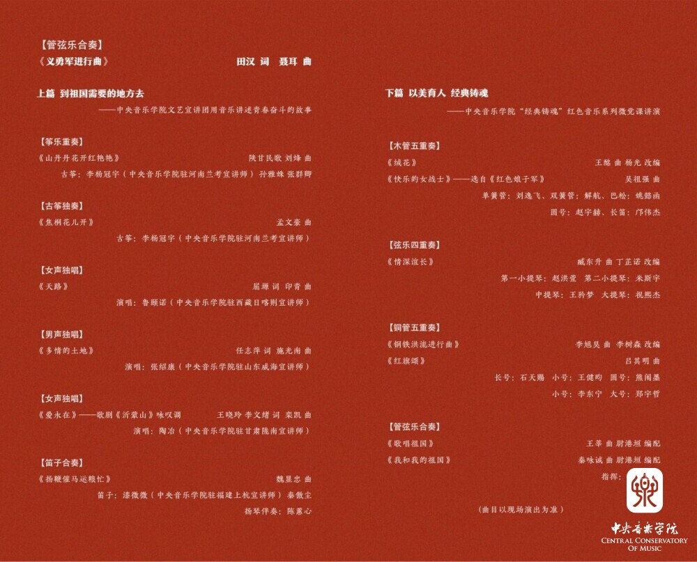 音乐会下篇延续品牌思政项目,“经典铸魂”红色音乐系列微党课讲演音乐会的经典形式,由辅导员、学生党员导聆,在校学生演奏,以木管五重奏、弦乐四重奏、铜管五重奏、管弦乐合奏等演奏形式演绎《绒花》《快乐的女战士》《情深谊长》《钢铁洪流进行曲》《红旗颂》等红色经典乐曲,普及音乐常识,介绍乐曲创作背景、时代意义,讲演结合,用音乐讲述中国精神、激发爱国情怀,以美育人、经典铸魂。音乐会最后,伴随着管弦乐队创新演绎的《歌唱祖国》《我和我的祖国》,全场观众热情挥动手中的国旗,与宣讲师一同高声歌唱,歌唱祖国、礼赞时代。