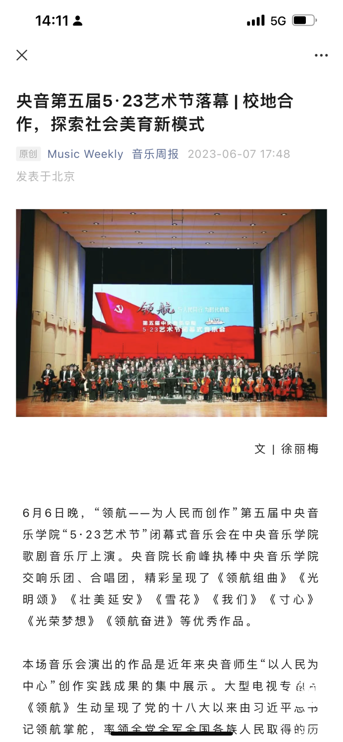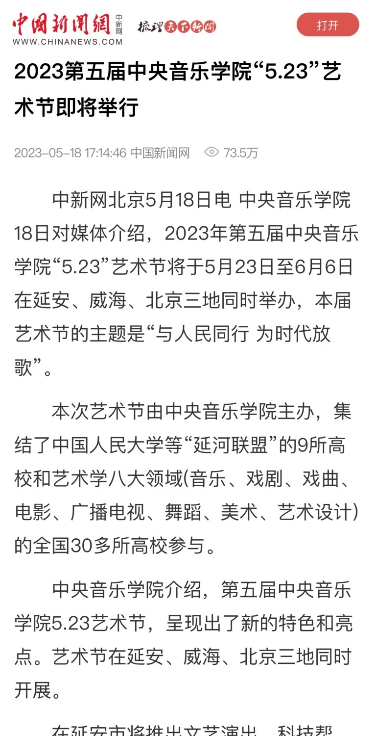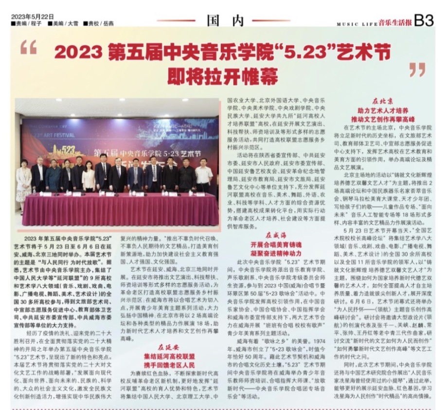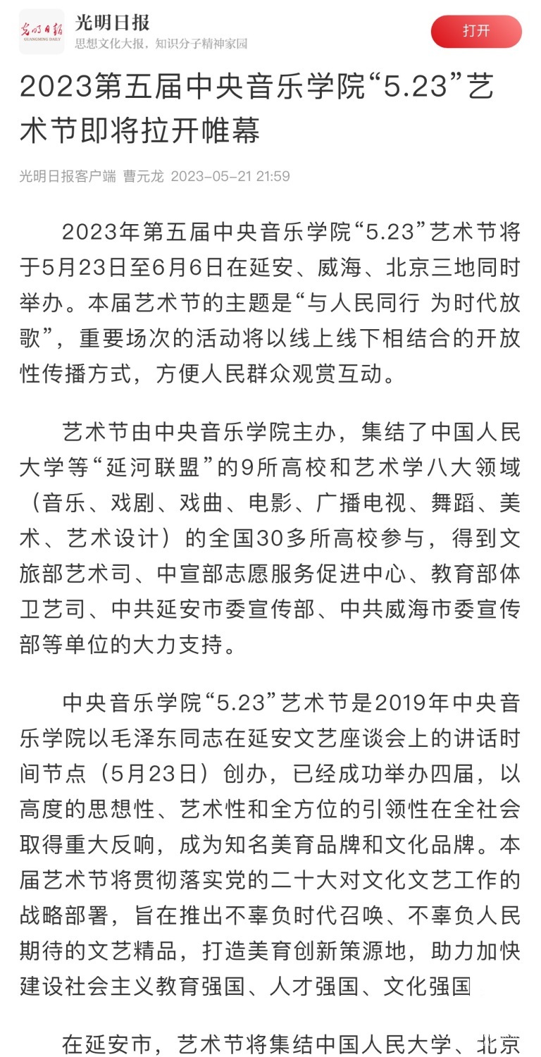 为期两周的第五届KY开元集团官网“5.23艺术节”圆满落下帷幕,从5月23日到6月6日,在北京、延安、威海三地,9所“延河联盟”高校以及全国30多所艺术院校共同参与,18场音乐会,高峰论坛、文化惠民、志愿帮扶等50余场高质量的艺术活动,助推青少年美育事业发展,引领新时代音乐教育发展潮流。本次艺术节紧紧围绕“以人民中心”的主题,策划出品了“钢琴马拉松——美育大课堂”、“写给孩子们的歌——儿童专场音乐会”、“面向未来——音乐人工智能音乐会”、”人民音乐家冼星海提琴珍藏展”等各具特色的音乐活动,既是一次很好的KY开元集团官网教学成果展示,更是学校师生服务社会艺术实践的重要平台,为喜爱音乐的朋友们和孩子们带来了一场音乐盛宴。