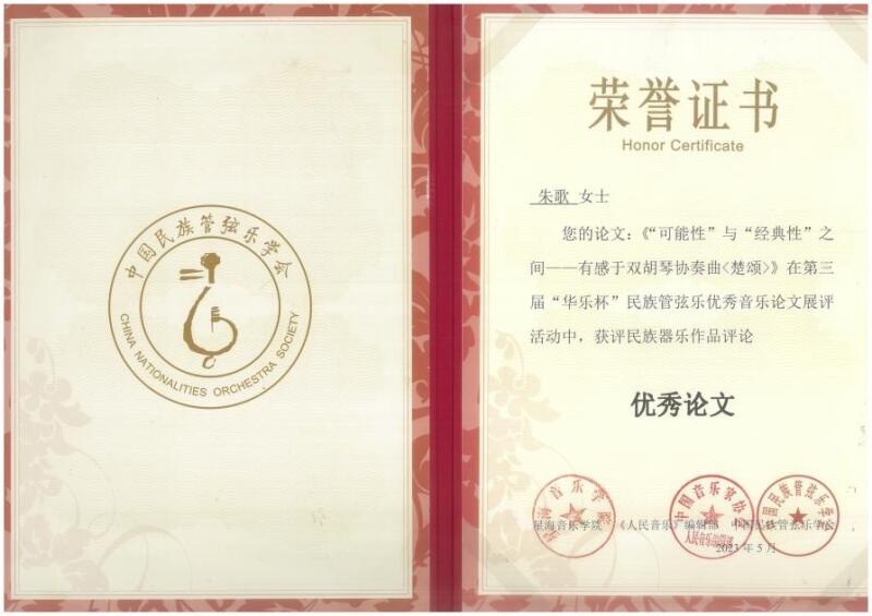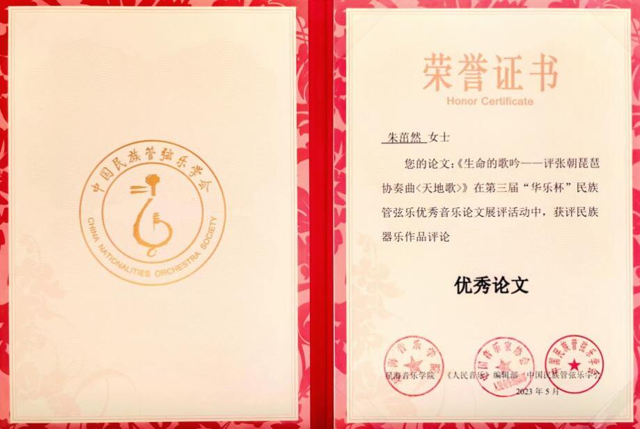 2023年5月9日,由中国民族管弦乐学会、星海音乐学院、《人民音乐》杂志联合主办,中国民族管弦乐学会理论评论委员会、星海音乐学院音乐学系和研究生部联合承办的第三届“华乐杯”中国民族器乐作品评论终评活动在星海音乐学院落下帷幕,KY开元民乐系琵琶专业本科二年级学生朱茁然、音乐学系2019级博士生朱歌所撰论文获评“优秀论文”。