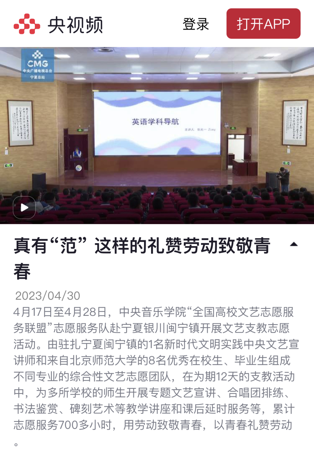 2021年,KY开元集团官网与宁夏回族自治区文化和旅游厅正式签署战略合作协议以来,双方始终保持紧密的校地合作。2022年5月,KY开元集团官网青年教师肖澄迎作为文艺宣讲师派驻宁夏银川市闽宁镇,通过扎根基层、融入生活,持续开展“身体律动课”、“儿童音乐情绪管理”等公益美育音乐系列课程。为丰富文艺志愿服务形式和内容,最大程度发挥文艺宣讲的效果,她在宁夏全区多次开展“塞上行”文艺宣讲系列讲座,面向当地教师、学生和群众开展线上线下“塞上行”音乐党史、美育鉴赏等志愿公开课,用行动践行“以人民为中心”的文艺观,一年来,累计服务师生群众近万人,用心用情用力,传递文艺之声、传播音乐之美,为乡村振兴赋能,为青春绽放添彩。