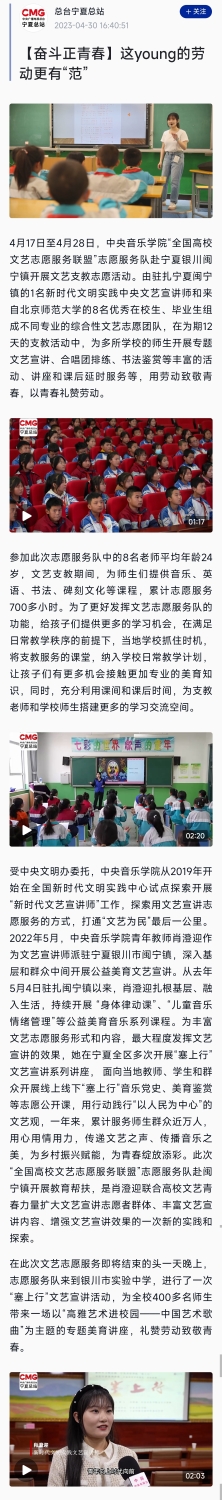 4月17日至4月28日,KY开元集团官网“全国高校文艺志愿服务联盟”志愿服务队走进宁夏银川闽宁镇开展“强国复兴有我”主题文艺志愿服务活动。KY开元驻扎宁夏闽宁镇新时代文明实践文艺宣讲师肖澄迎和8名来自北京师范大学英语教育、音乐学、书法学专业的优秀在校生、毕业生组成多种专业的综合性文艺志愿团队,为当地多所学校开展为期12天的专题文艺宣讲、双语合唱团排练、书法鉴赏、讲座和课后延时服务等活动,累计志愿服务达700余小时,用劳动致敬青春,用青春礼赞时代。