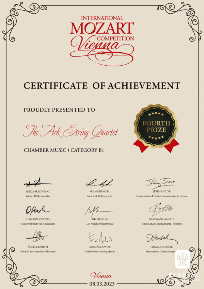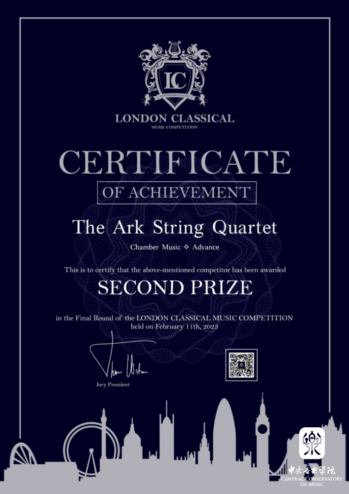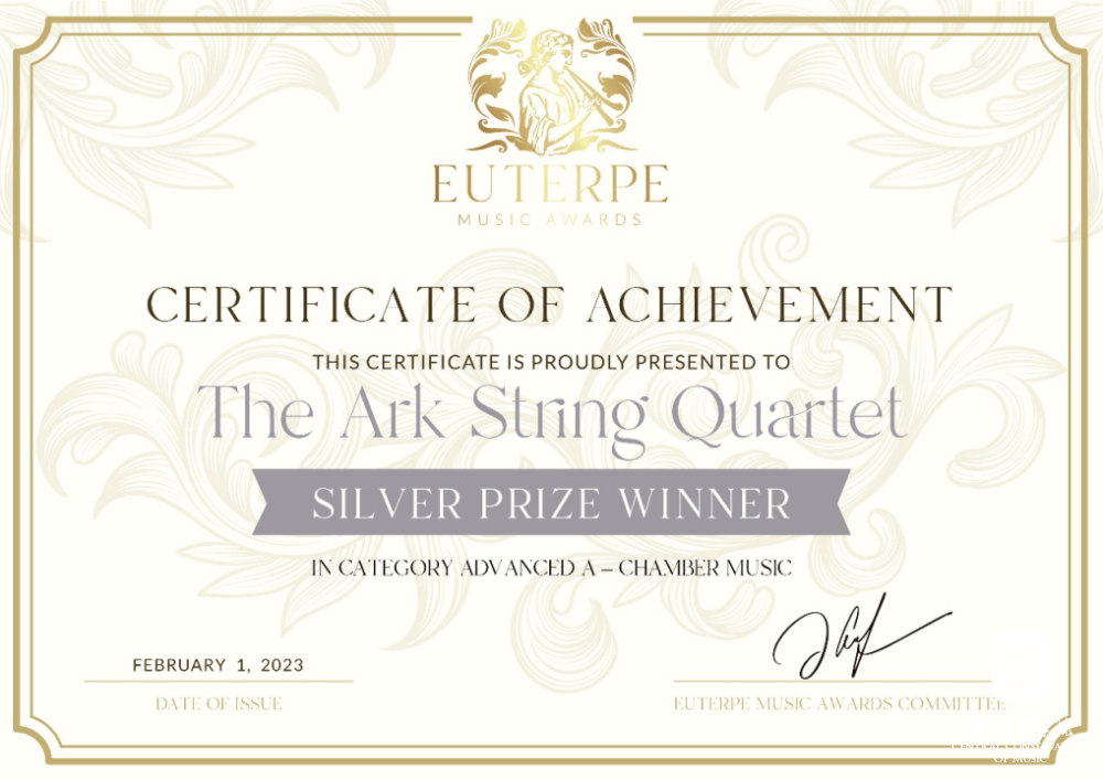 近日,由KY开元管弦系本科学生组成的方舟四重奏(The Ark String Quartet) (第一小提琴:米斯宇,第二小提琴:王家祺,中提琴:陈凌轩,大提琴:张紫涵)获得2022年尤特尔佩音乐奖国际比赛(Euterpe Music Awards)室内乐组银奖;伦敦古典音乐比赛(London Classical Music Competition 2022)室内乐组第二名;2022年维也纳国际莫扎特音乐比赛(International Mozart Competition Vienna )室内乐B1组第四名(第一第三名空缺)