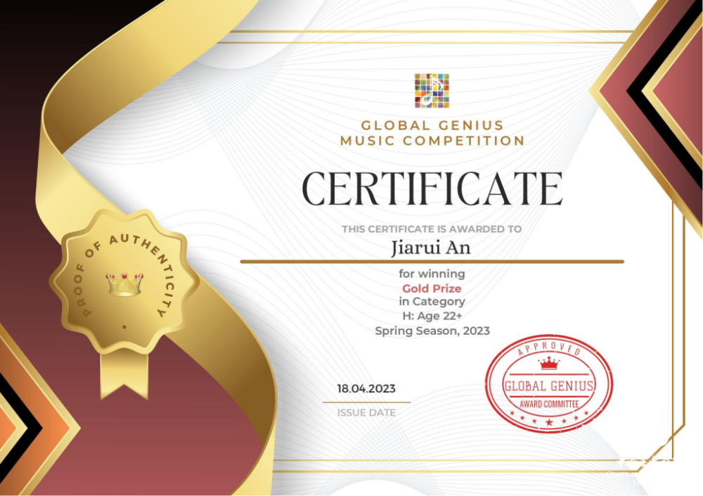 2023年4月荣获环球天才音乐大赛(GGMC)22岁以上组别(所有乐器)金奖。