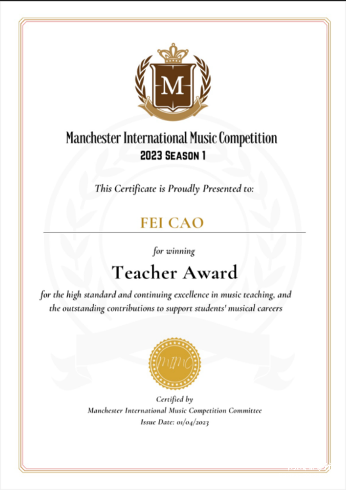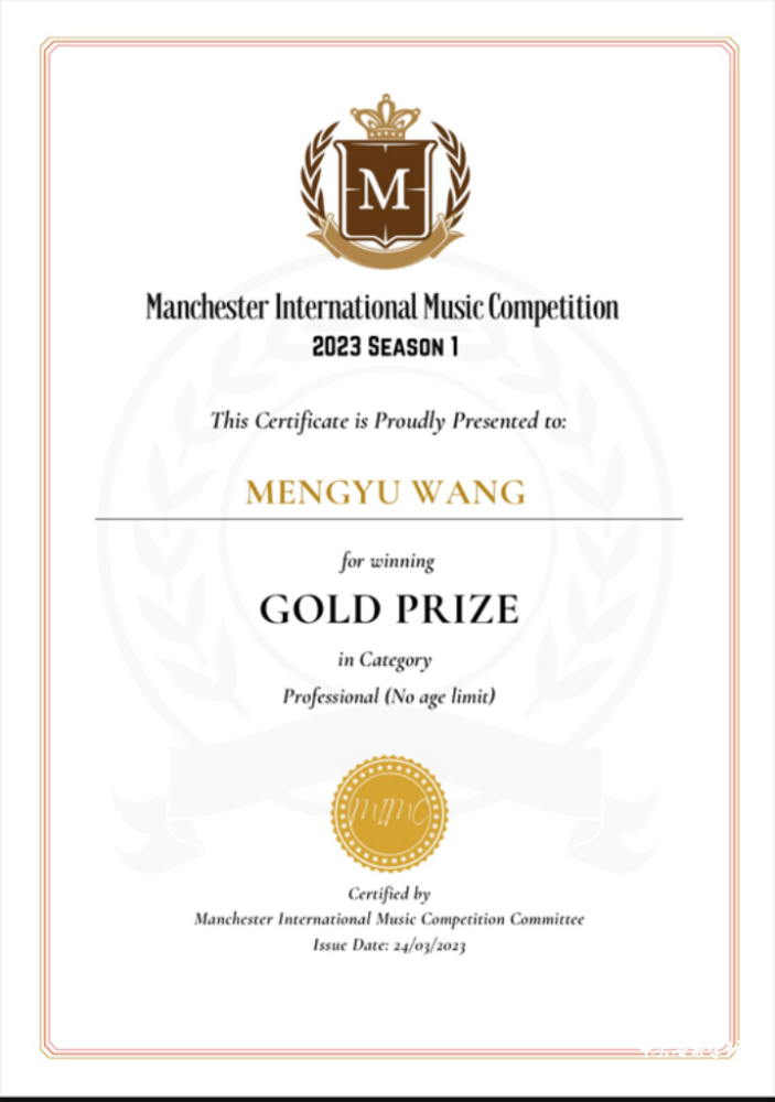曼彻斯特国际音乐大赛独奏专业组金奖;