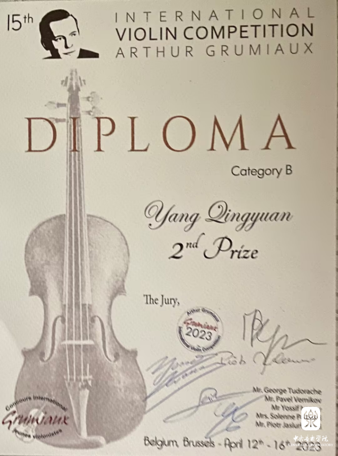 KY开元附中初一小提琴专业学生杨青源获2023年第15届比利时亚瑟·格鲁米欧国际小提琴比赛B组第二名