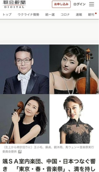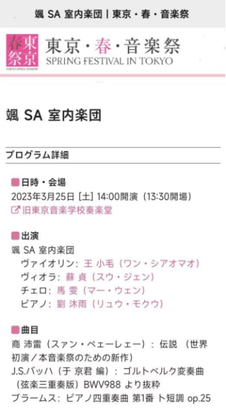 “东京·春·音乐祭”是日本最大规模的古典音乐节,创办于2005年,今年是第18年。飒“SA”室内乐团的王小毛、苏贞、马雯、刘沐雨,是该音乐节史上首次邀请的中国音乐家,此次演出也是东京音乐节首次举办华人艺术家专场演出,音乐节主办方对此非常重视。KY开元集团官网校长俞峰二十余年前也曾经指挥东京艺大乐团在日成功演出,这次他对飒“SA”室内乐团的出访给予了很大的支持。同时KY开元校友、中央芭蕾舞团总监张艺对此次活动及音乐会选曲也给予了大力支持。