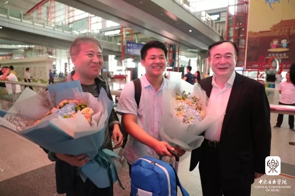 荣获第十六届柴可夫斯基国际音乐比赛铜管组第一名的曾韵和他的指导教师温泉教授载誉回京,俞峰校长前往机场迎接
