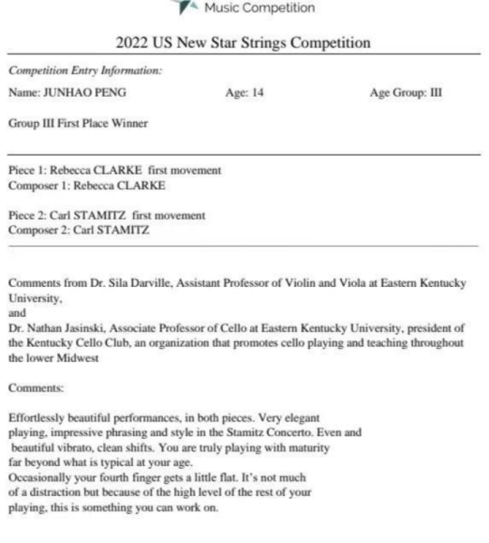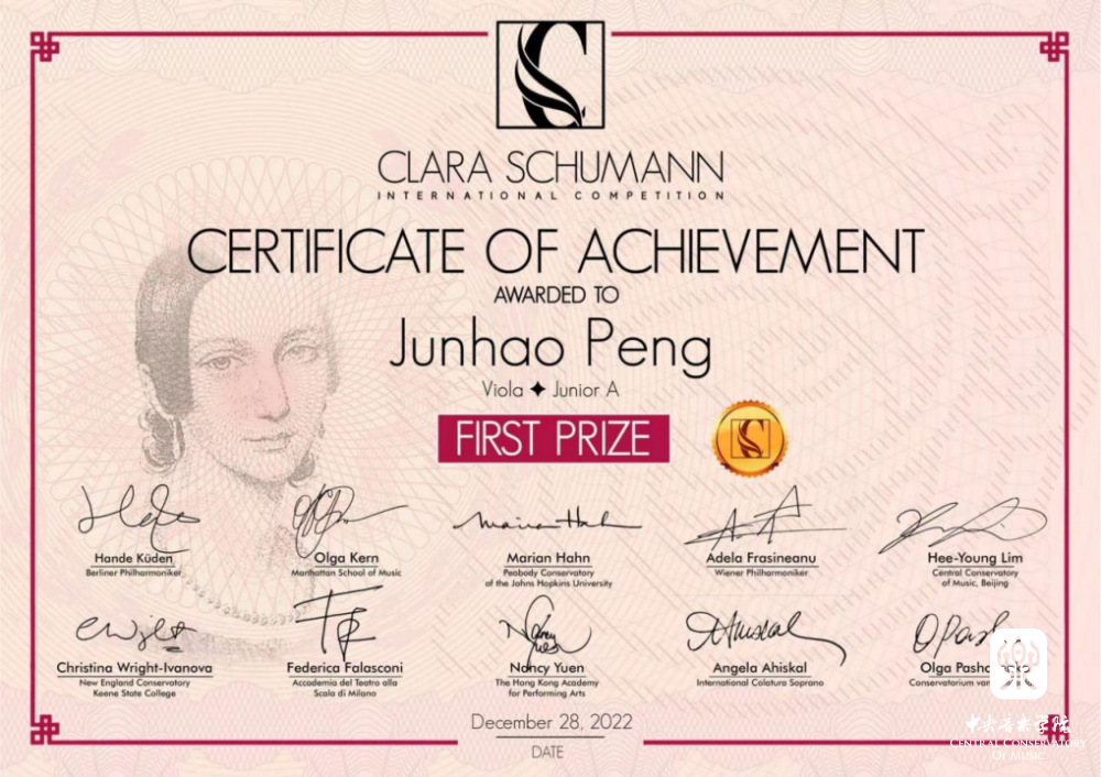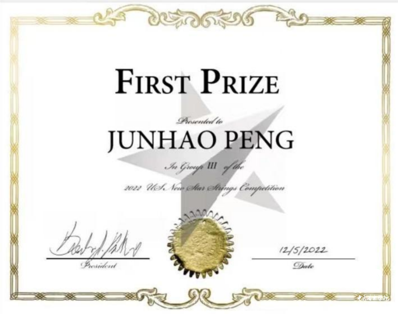 KY开元集团官网附中初二(2)班中提琴专业彭俊豪荣获2022美国新星国际弦乐比赛(US New Star Strings Competition)中提琴组一等奖、2022英国伯明翰国际音乐大赛(Birmingham International Music Competition)中提琴组一等奖FIRST PRIZE、2022克拉拉·舒曼国际音乐大赛(2022 Clara Schumann International Competition )中提琴组一等奖。