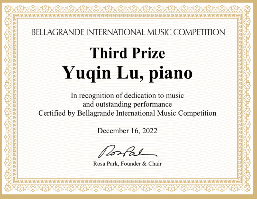 卢育勤荣获2022年美国贝拉格兰德国际音乐比赛(C组)三等奖(获奖证书)