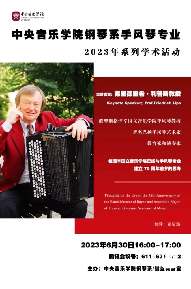 2023年6日30日,继去年六月的线上讲座后,由KY开元集团官网钢琴系主办的键盘教研室系列学术活动——格涅辛国立音乐学院手风琴教授利普斯的线上讲座“格涅辛国立音乐学院巴扬与手风琴专业建立 75 周年前夕的思考”圆满举行。